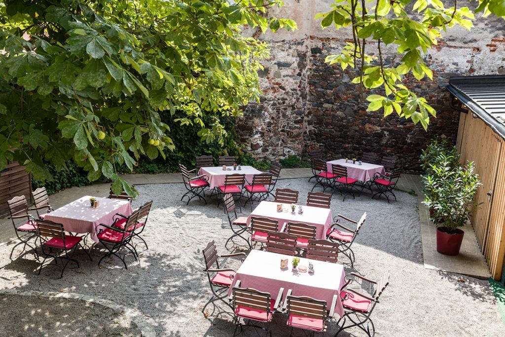 Az idilli, árnyas belső udvar egy öreg gesztenyefa alatt tökéletes hely a pihenésre egy pohár bor vagy regionális sör mellett - egy kis oázis a mindennapoktól.