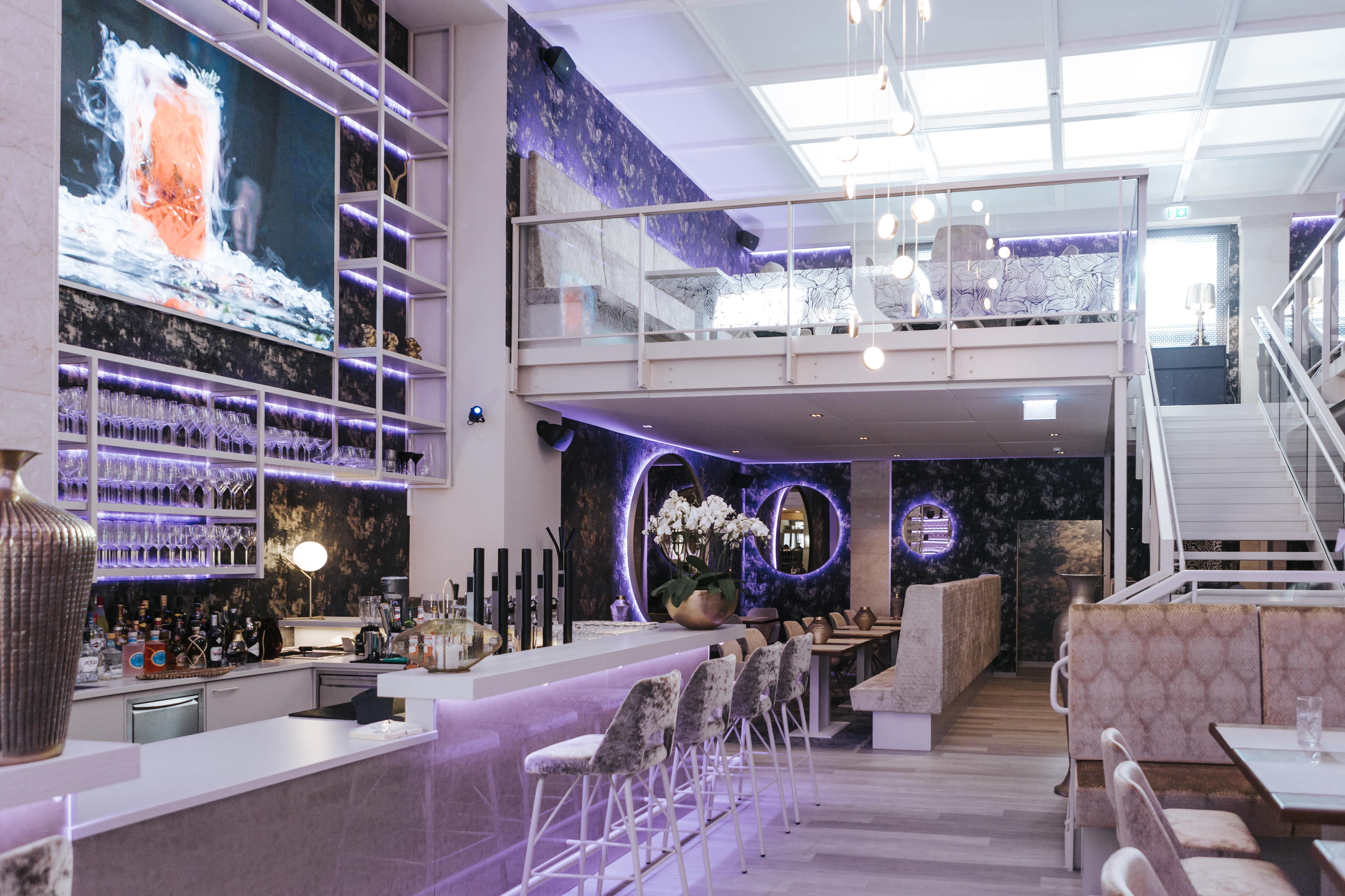 A belső tér elegáns dizájnnal és hangulatos sarkokkal büszkélkedhet, a galéria és a nyitott látványkonyha pedig élénk hangulatot teremt. Nyáron a vendégkert elidőzésre invitál, és elbűvölő kilátást nyújt a városi nyüzsgésre.