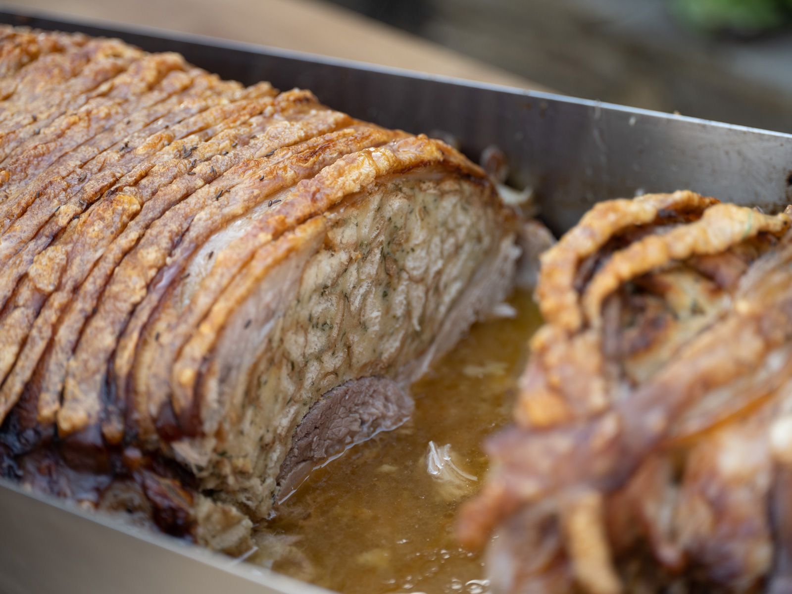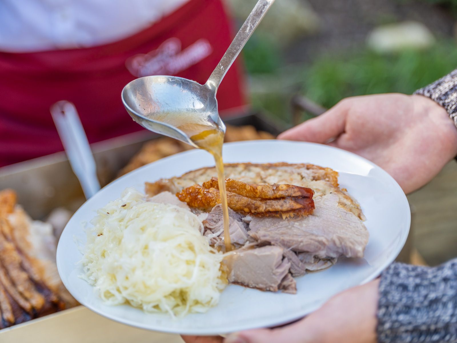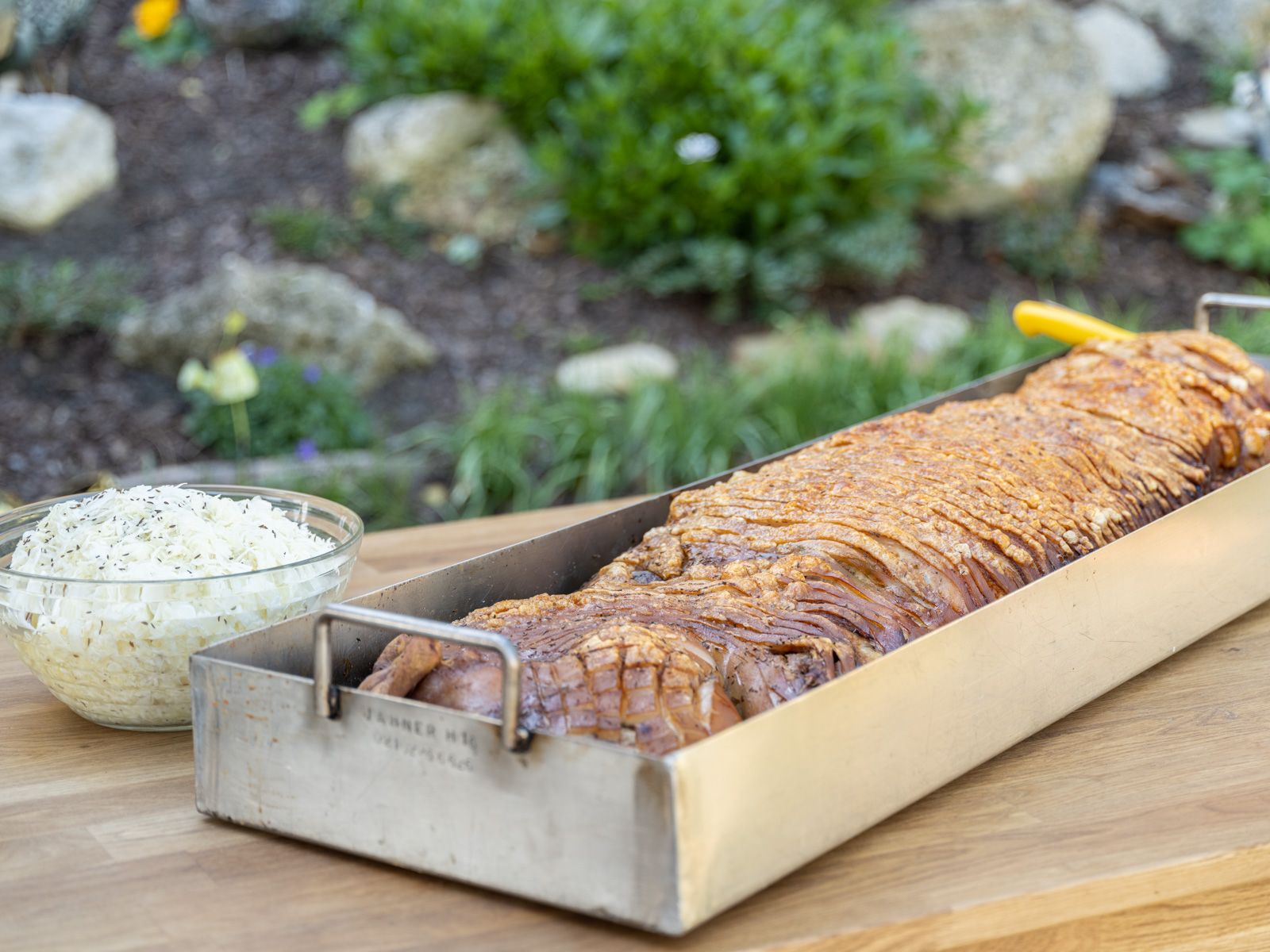 Ízletes szopósmalacaink elkészítése a fűszerezéssel kezdődik. Tökéletesen összehangolt köretként a szopósmalac hasában zsemlével töltött tölteléket sütünk. Kérésre házi káposztasalátát is fogyaszthat saját repceolajból készült páccal. A kenyértöltelékhez és a káposztasalátához kizárólag a régiókból származó termékeket használunk. A végén aranybarna bőr, zsenge hús és ízletes mártás várja.