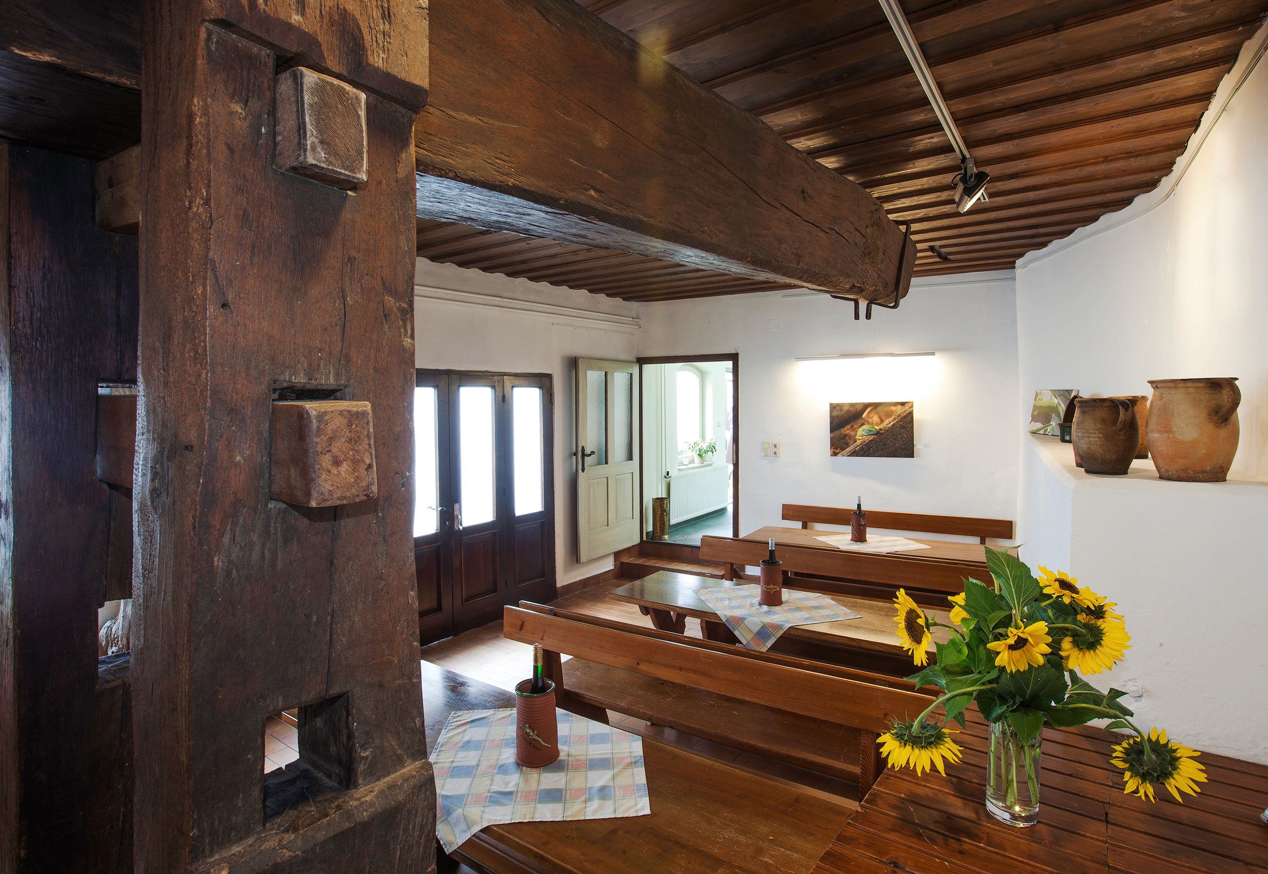A hagyományos borozó hagyományos specialitásokat és regionális finomságokat kínál boraink mellé. A kertben élvezheti a csodálatos kilátást a fehérenkircheni szőlőhegyekre. Ha az időjárás nem játszik velünk, akkor a régi présházból kialakított, eredeti fa présházból kialakított borozó is rendelkezésre áll.