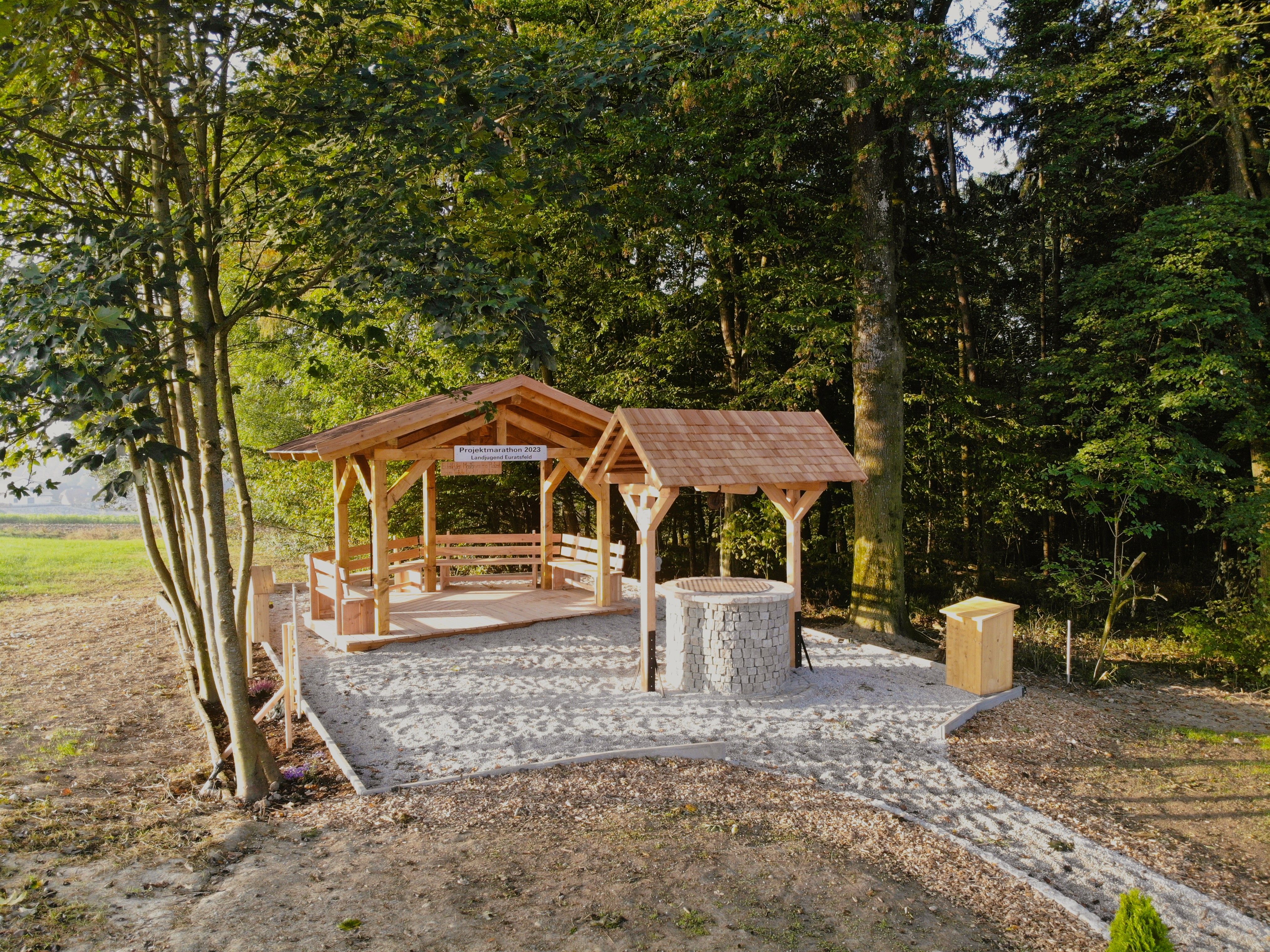 Maga a szökőkút szeretettel díszített fa- és fémművekkel. Egy italkosár hűsítő italokat kínál, míg egy menedéket nyújtó pavilon hangulatos ülőhelyekkel hívogat elidőzésre. A szökőkút körül ültetett területek, a biológiai sokféleséget elősegítő rovarhotel, játszóterek a gyerekeknek és olyan kreatív részletek, mint egy vendégkönyv, amelynek címe: "Hod da dea Gyümölcsbor, trog di in unser Biachal ein".