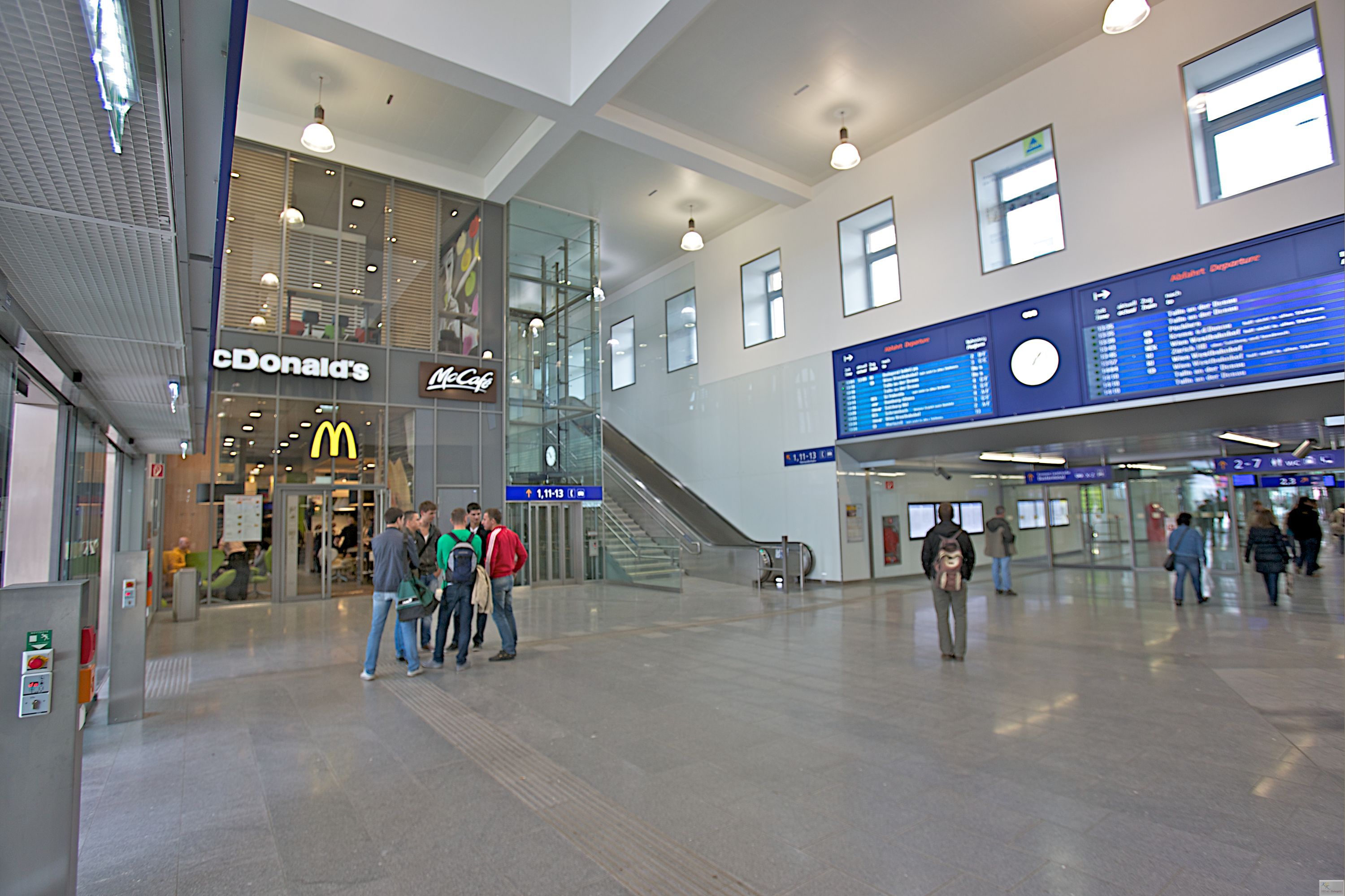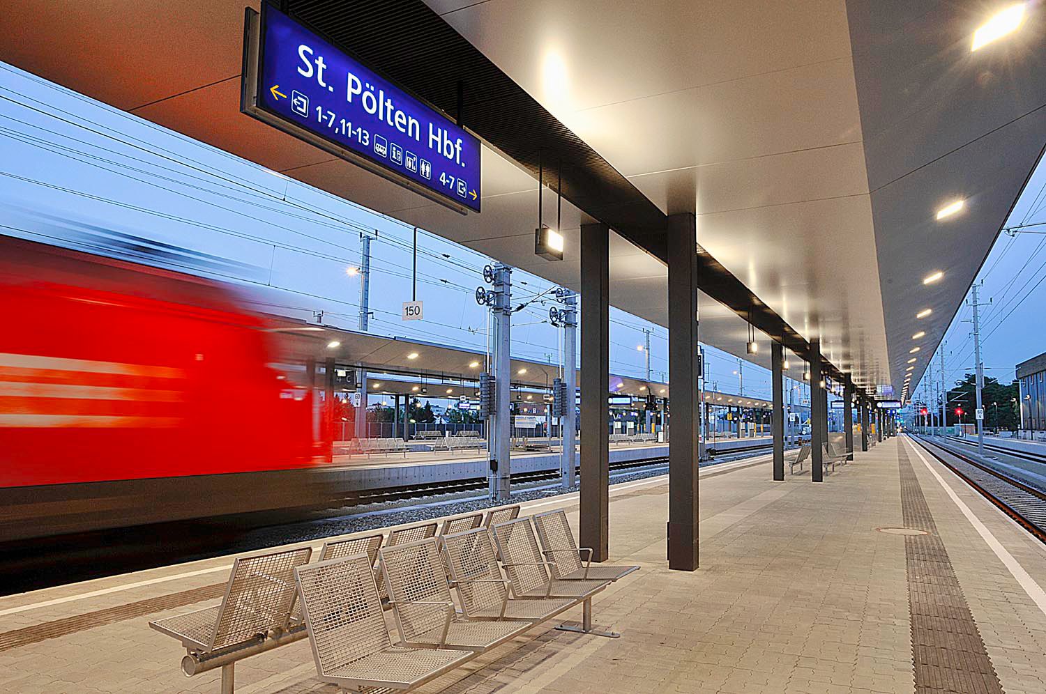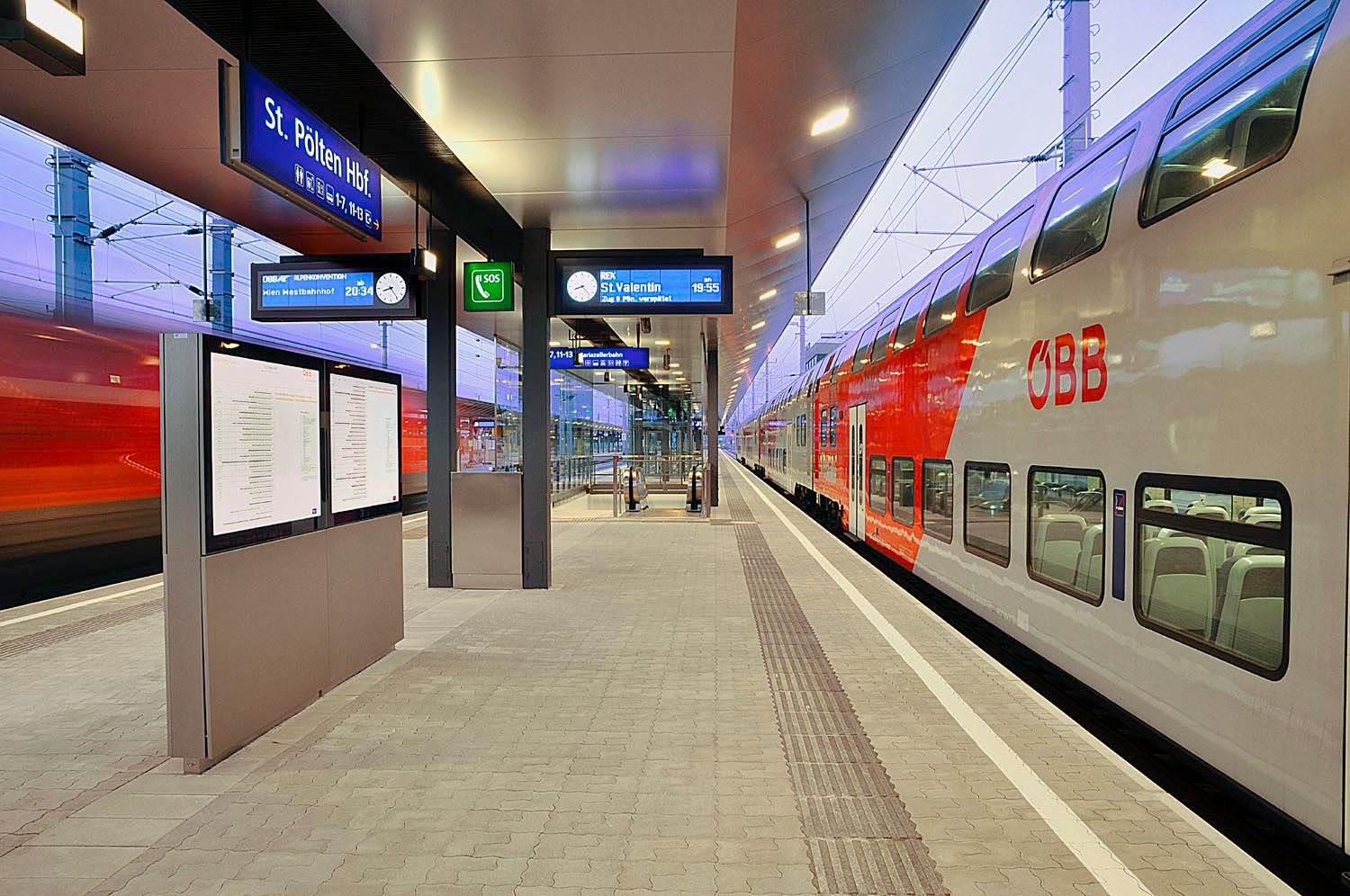 St. Pölten főpályaudvarát ma egy fényárban úszó csarnok jellemzi jegyautomatákkal és információs központtal, kényelmes vásárlási lehetőségekkel, valamint mozgólépcsőkkel és liftekkel.