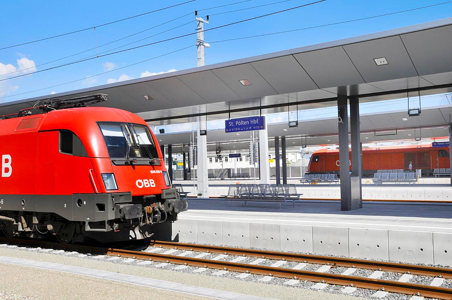 A teljesen felújított peronok, az aluljáró és az utasalagút, valamint a tágas előpályaudvar szintén modern vasúti közlekedést biztosít. A rövid távú parkolóhelyekkel, az ötemeletes parkolóházzal és a kerékpárok számára kialakított fedett parkolóhelyekkel elegendő parkolóhely áll rendelkezésre St. Pölten belvárosának közepén.