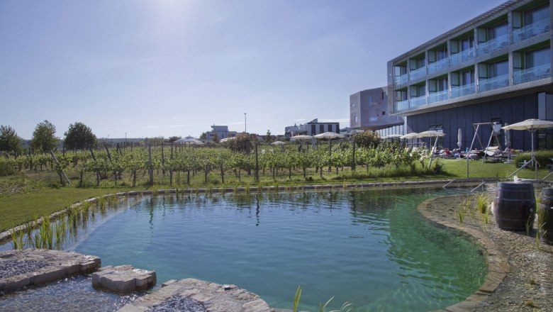 A jó 1000m2 –es belső teret – szaunával, fitneszteremmel és fürdővel – szabadtéri, egész évben fűtött medence, természetes tó, valamint a kertben kifüggesztett függőágyak egészítik ki. A Loisium Weinwelt „lebegő szállodája“ csodás kikapcsolódást kínál.