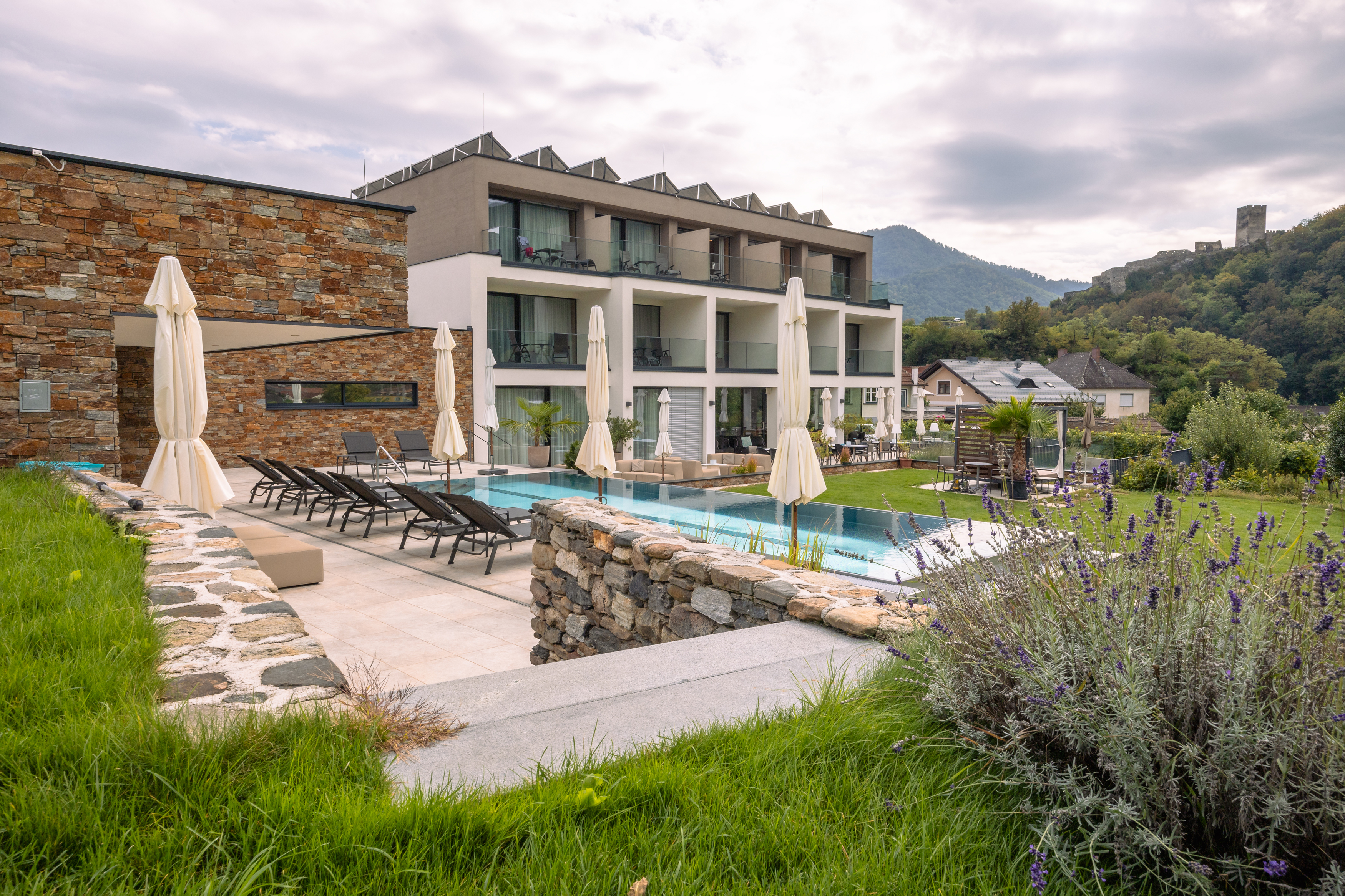 Tizenegy tágas, formatervezett teraszos lakosztály a Tausendeimerberg (ezer vödör hegye) mögötti Spitzer-szőlőhegy közepén. Mindegyikből lenyűgöző kilátás nyílik a Wachau teraszos szőlőültetvényeire. Négy közülük infrakabin és egy nagy fürdőkád a nappaliban a privát spa érzését nyújtja, míg a kültéri medence és a szaunaház közösen használható. A finom ételek és italok szintén hozzátartoznak a jólléthez: a svédasztalos reggelihez tálalt regionális termékektől és a házi lekvároktól a füstölt húsokon és a füstölt húsokon át a saját szőlőből készült szőlőléig és borig.
