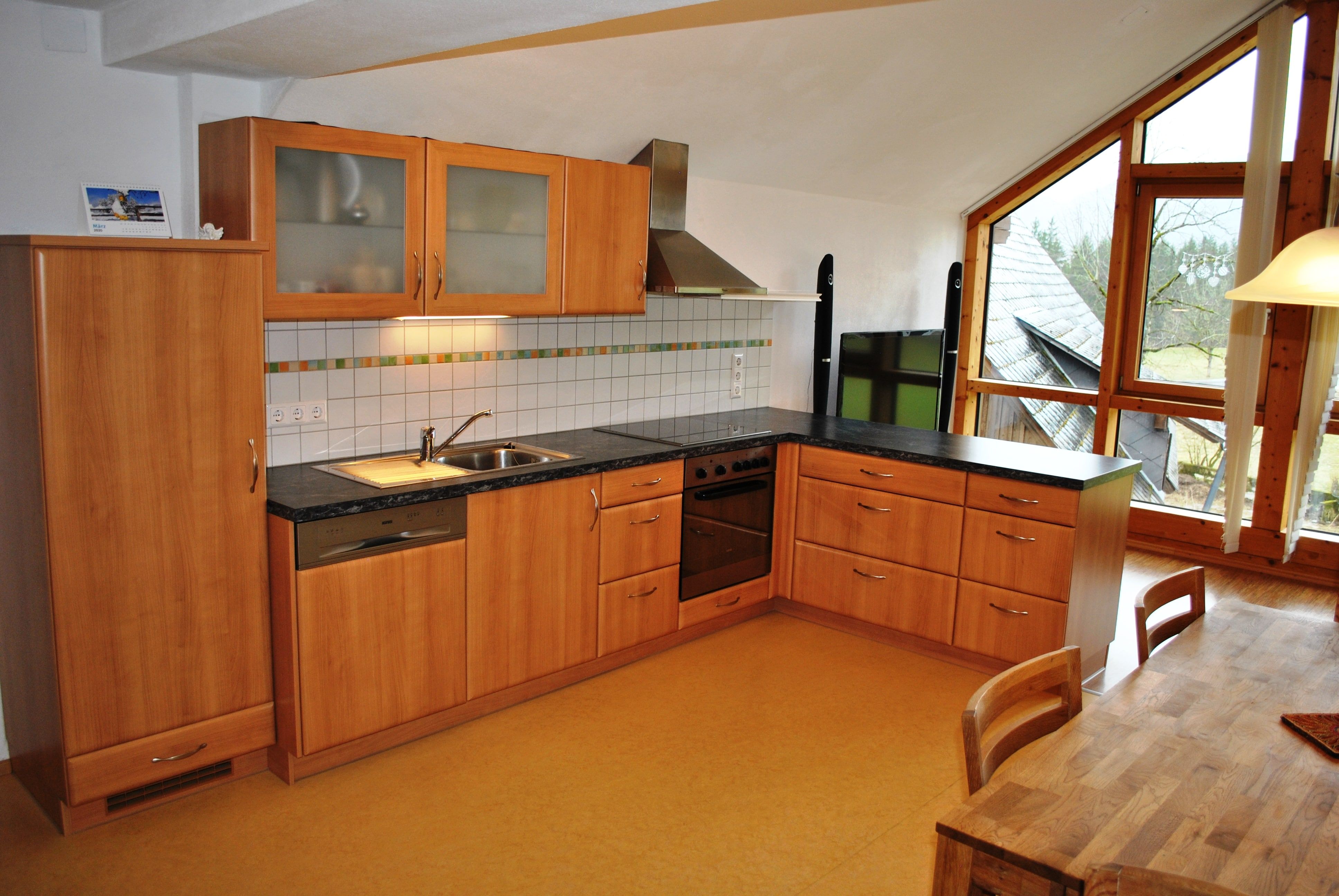 A konyha jól felszerelt, hűtőszekrénnyel, főzőlappal, sütővel, vízforralóval, kávéfőzővel és mosogatógéppel.