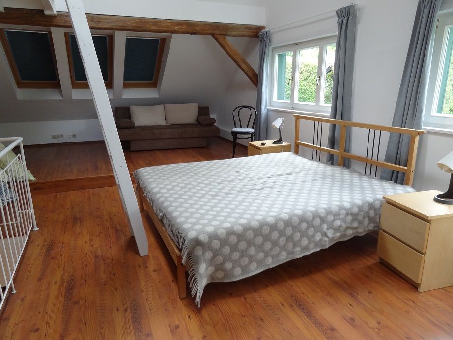 Egykis könyvtár színes könyvkínálattal hívogat elidőzésre és pihenésre. Az emeletre vezető lépcső a hálórészbe vezet. A teljes felső emelet nyitott, és egy hálórészre van osztva, ahol egy kényelmes franciaágy, egy kihúzható kanapé a pihenéshez és egy létra a tetőtéri ágyhoz. A nyaraló apartman 2-5 fő számára kínál helyet. A szobában zuhanyzó és WC is rendelkezésre áll.