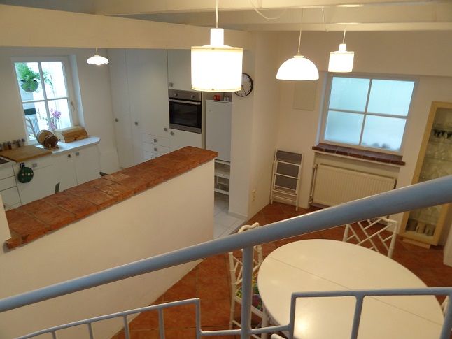 A földszint egy tágas konyhaszigettel ellátott konyhára ( jól felszerelt), egy hangulatos nappalira, ülőhelyekkel és egy kandallóval* van felosztva, amely kellemes meleget biztosít a hidegebb napokon. TV, rádió és W-Lan az alapfelszereltség része. *A kandallóhoz fa rendelkezésre áll