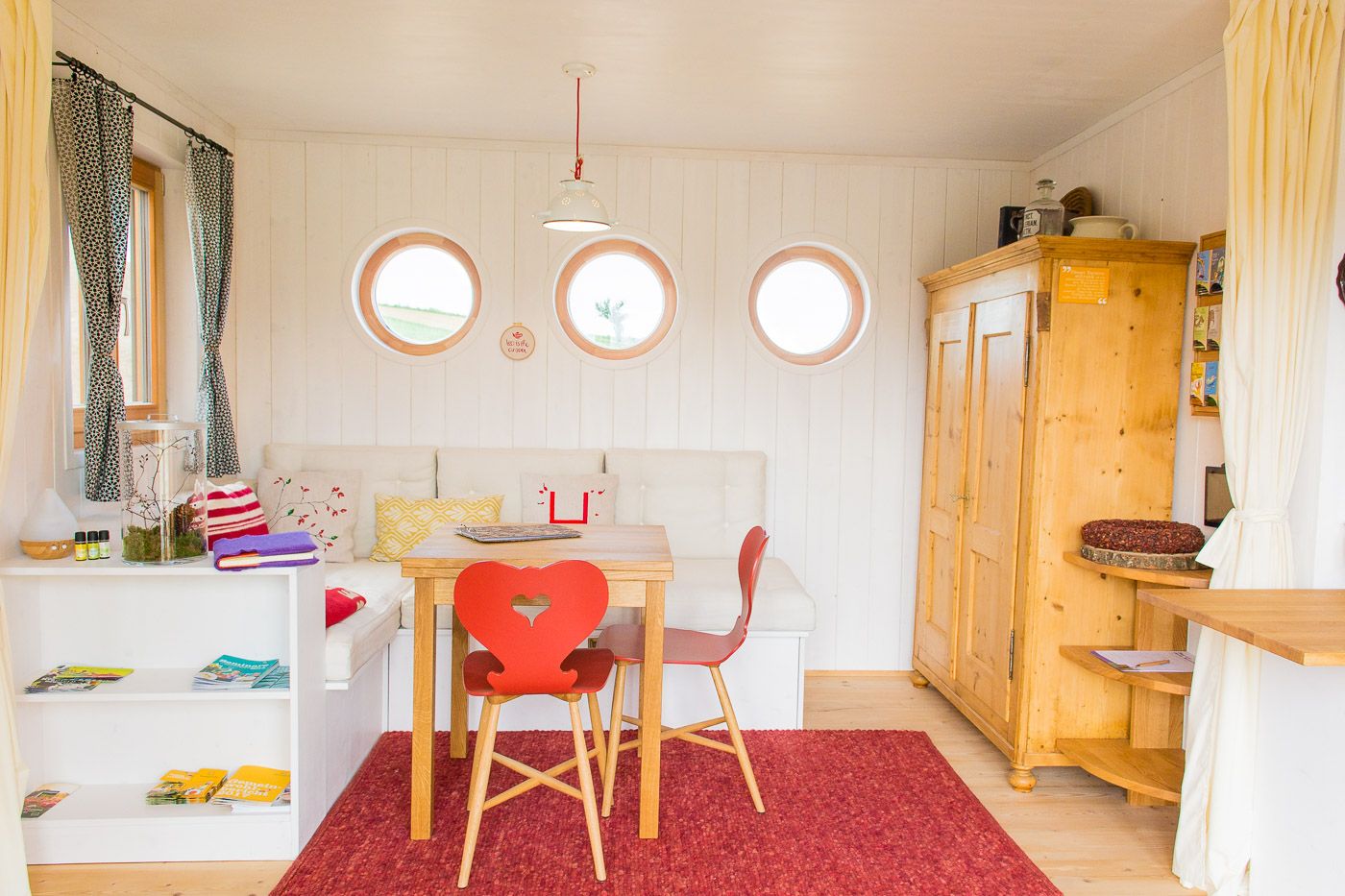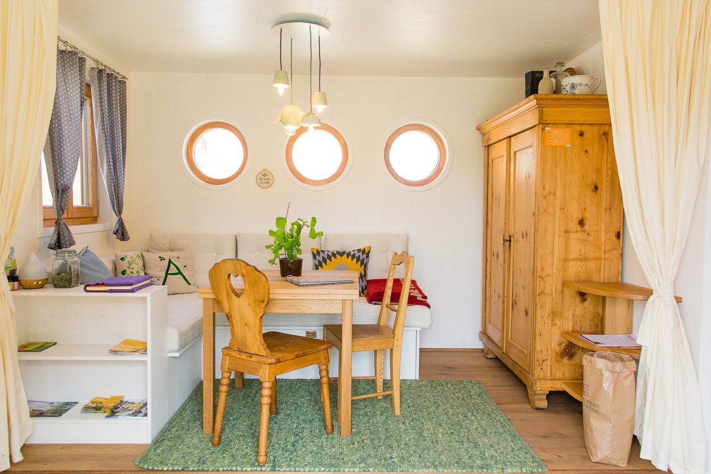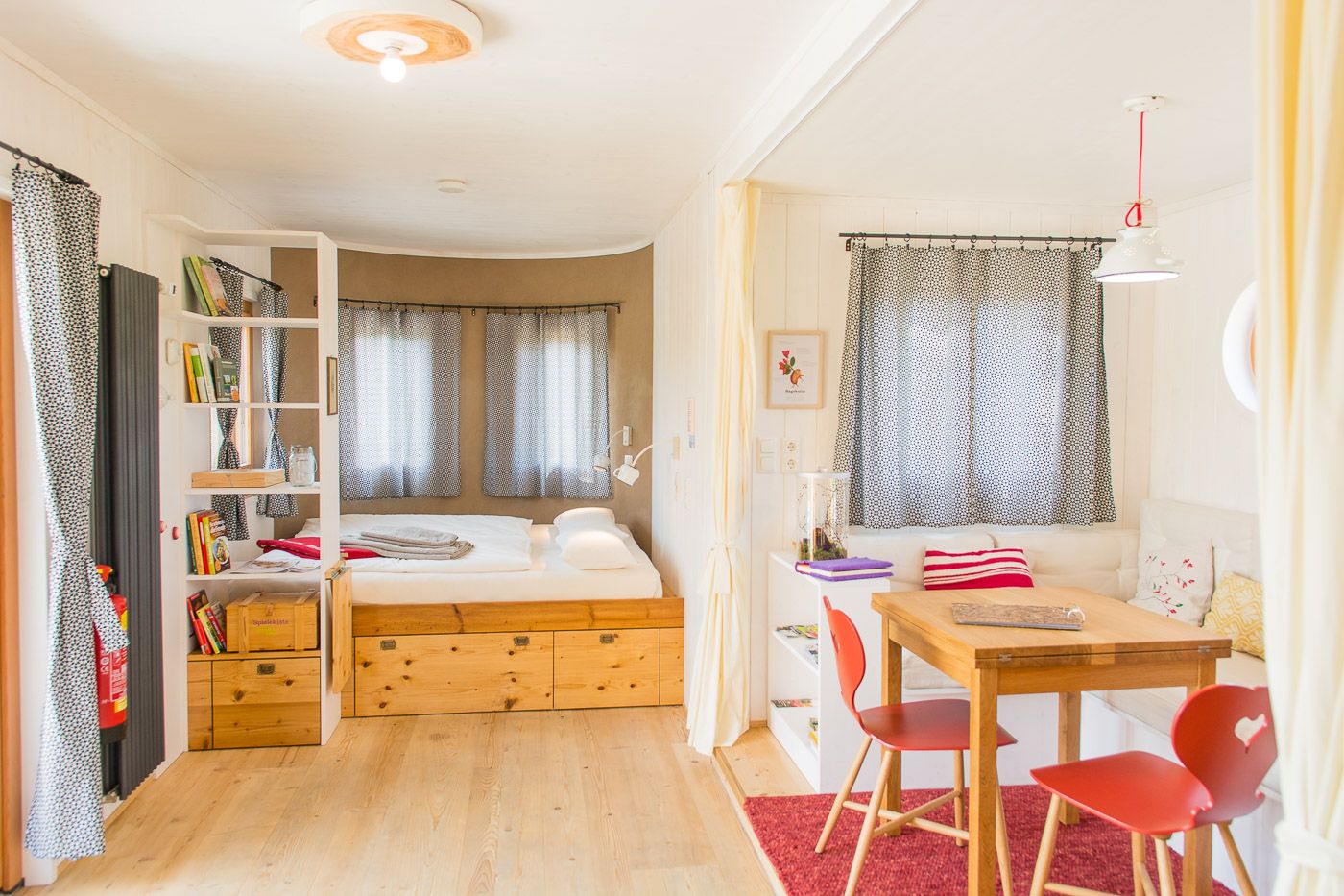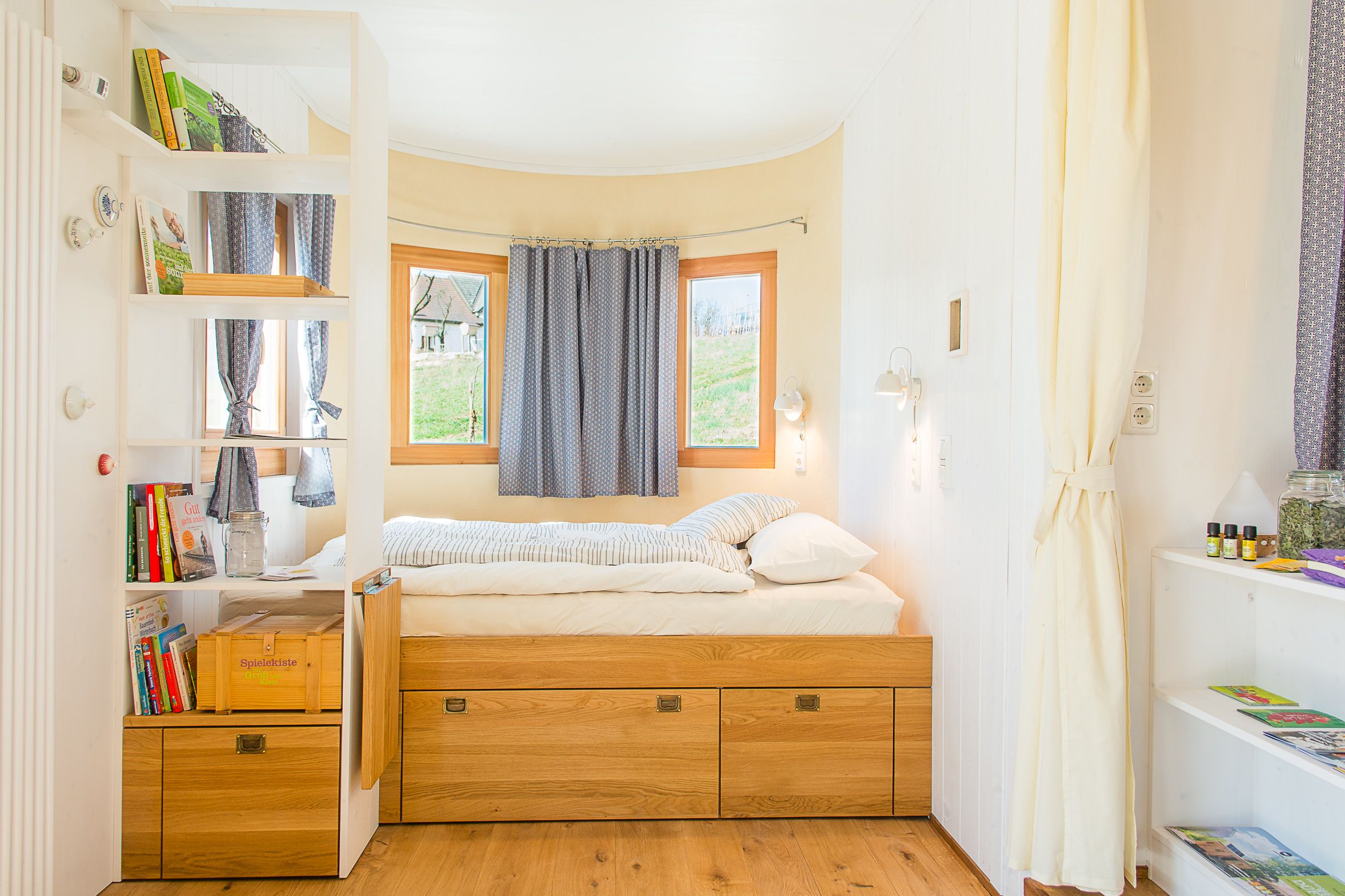 Ez a két egyedülálló szálláslehetőségegyenként 31m2-en várja Önt, hogy teljes mértékben élvezze a természetet, kitisztítsa elméjét és kikapcsolódjon. A 100%-ban regionális alapanyagokból, például tömör fából és juhgyapjúból épült két lakókocsi négy személynek vagy egy ötfős családnak kínál helyet. A két vidéki loft teljesen felszerelt konyhával, zuhanyzóval és tágas nappali- és hálótérrel rendelkezik. Az olyan egyedi berendezési részletek, mint a fatüzelésű kályha, az áram nélküli kávéfőző és a hőpuffer tartály zökkenőmentes energia- és erőforrás-körforgást biztosítanak.