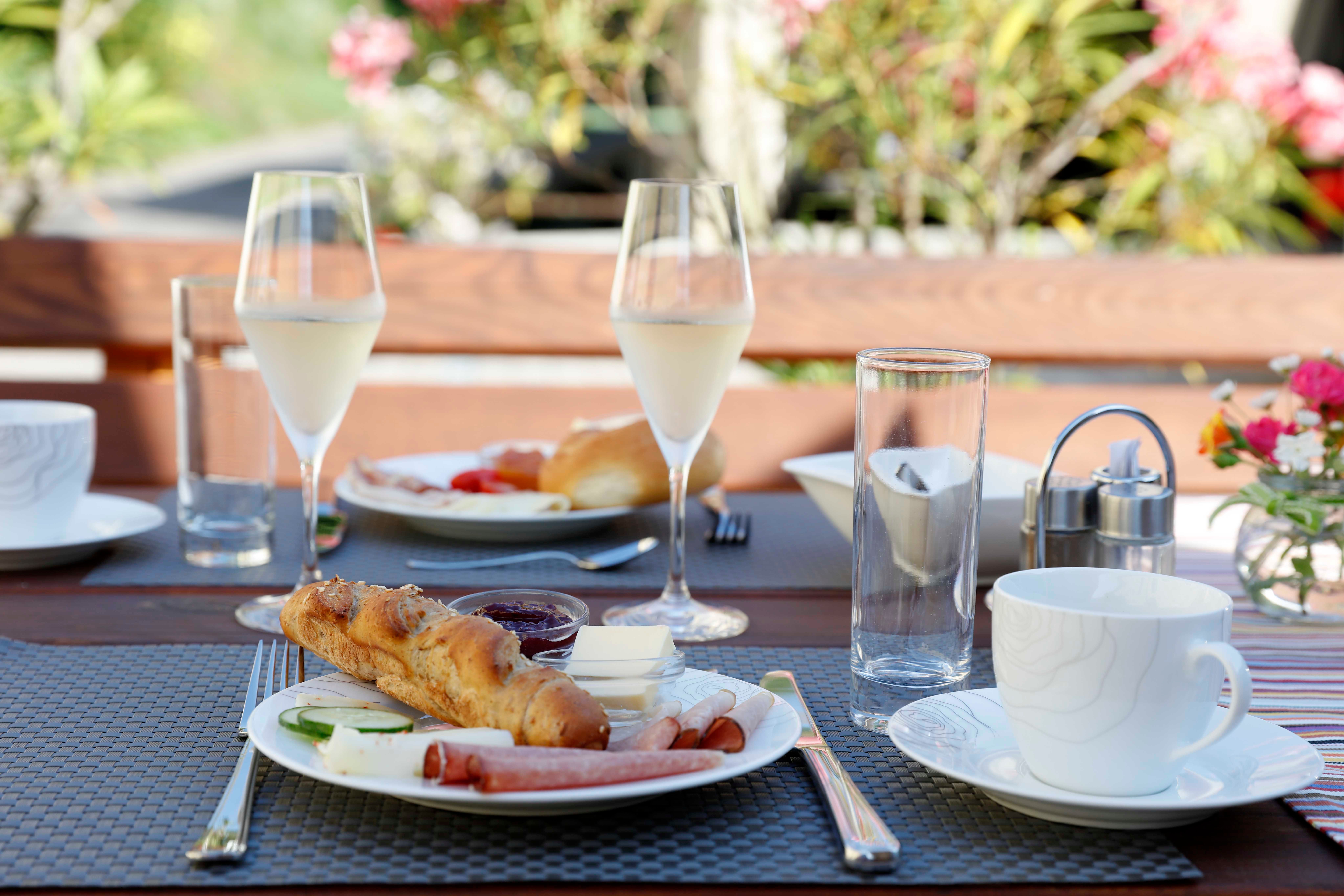 Külön kiemelendő a bőséges reggeli, amelyet szép időben a napozóteraszon szolgálnak fel. A vendégeket regionális termékek, frissen készített tojásételek és a szálloda saját szőlőlevével várják. Kérésre egy pohár Frizzante is rendelkezésre áll.