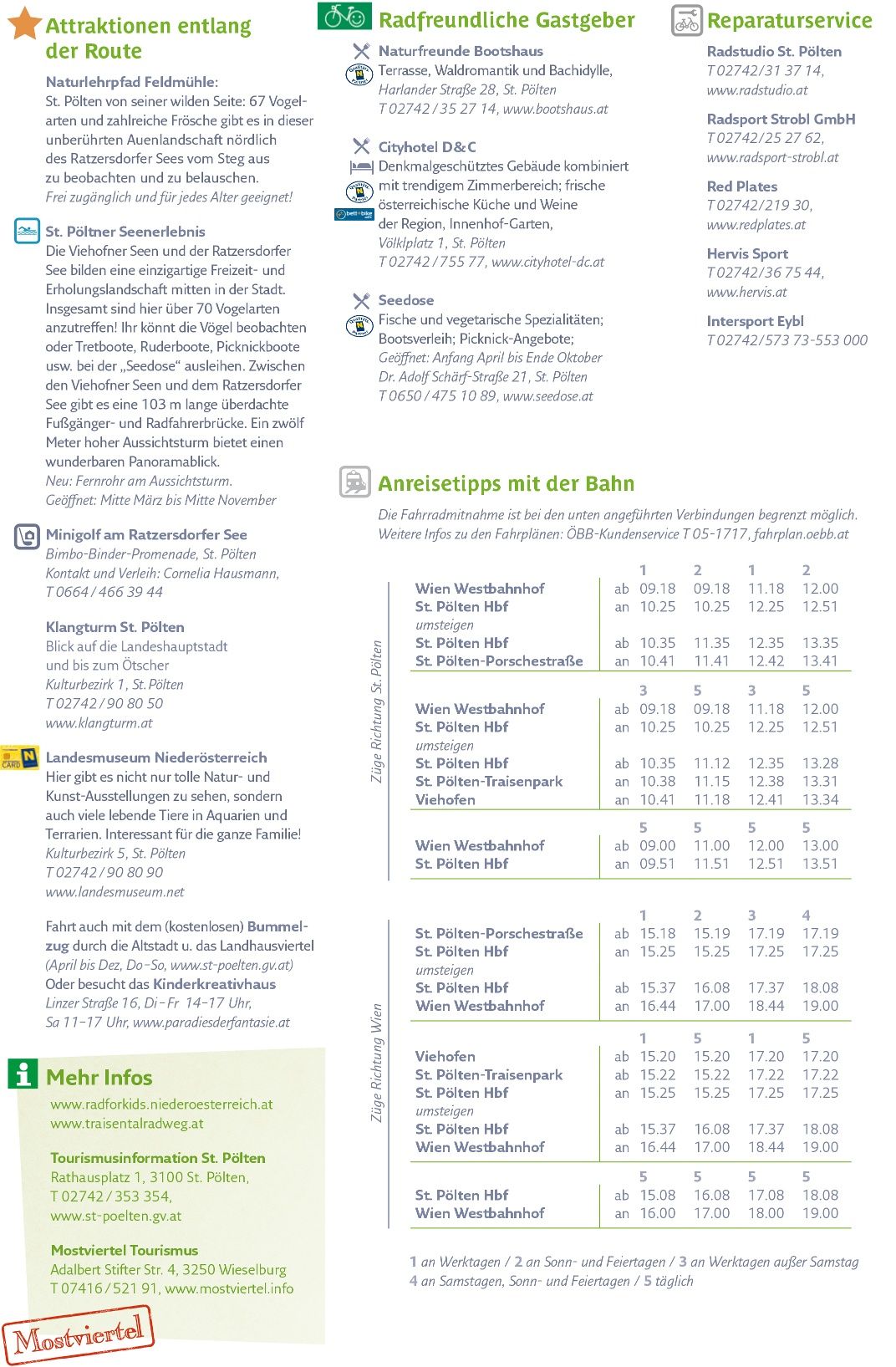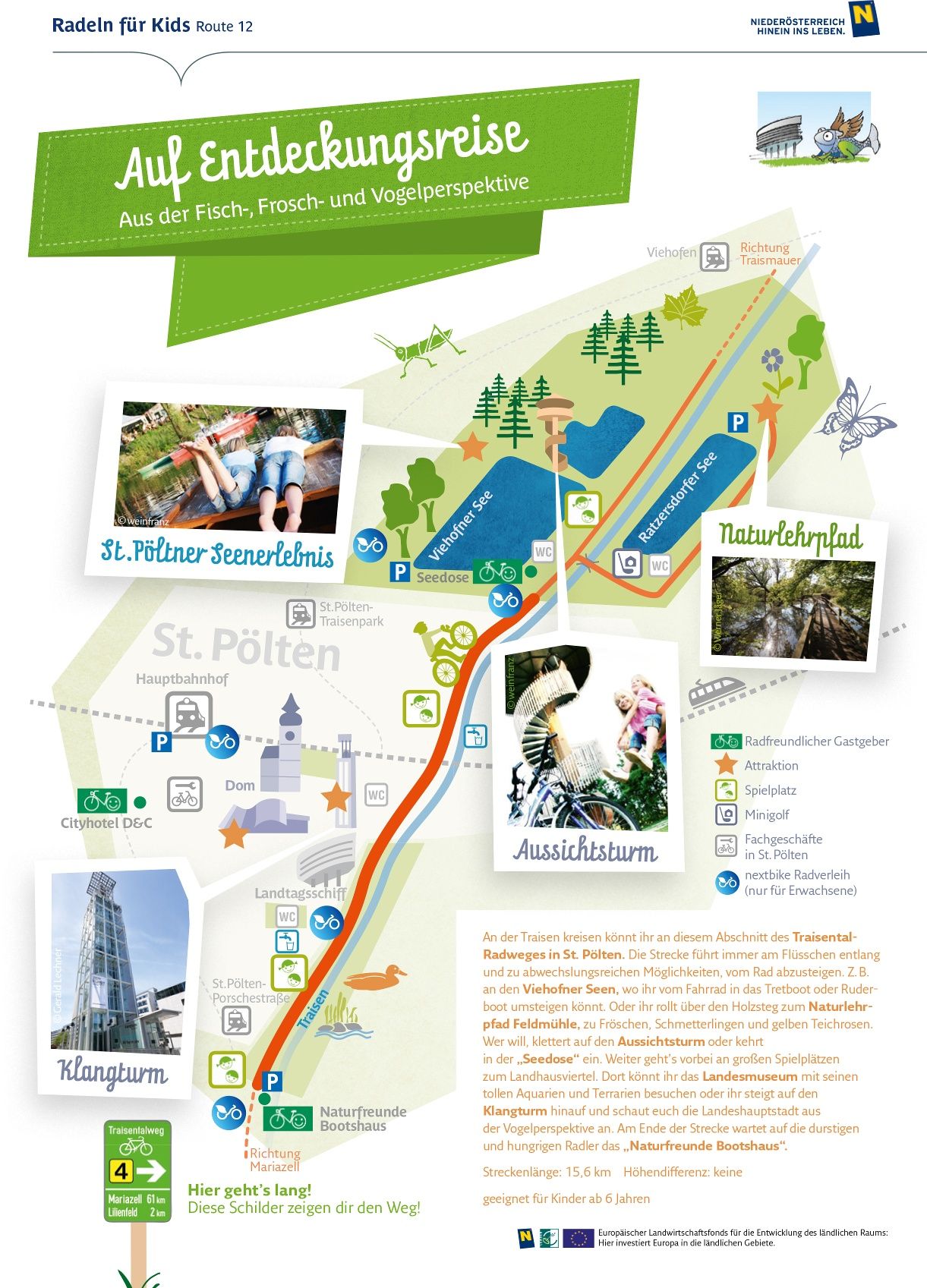 Ha szeretne, felmászhat a kilátótoronyba, vagy megállhat a "Seedose" nevű kilátónál. A nagy játszóterek mellett haladjon tovább a Landhausviertelbe. Ott meglátogathatja a Museum Niederösterreicht a fantasztikus akváriumokkal és terráriumokkal, vagy felmászhat a Klangturmra, és madártávlatból láthatja az állam fővárosát. Az útvonal végén a "Naturfreunde Bootshaus" várja a szomjas és éhes kerékpárosokat.