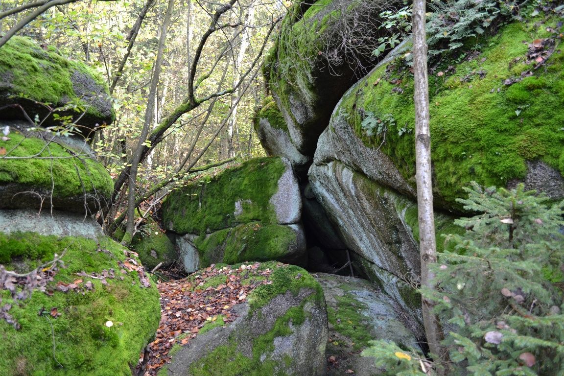 A Kreuzbergi panorámaút (62. sz.) Eisgarn legmagasabb pontján, a Kreuzbergen át vezet Klein-Radischenbe, a Höllgraben-kőformáció mellett.