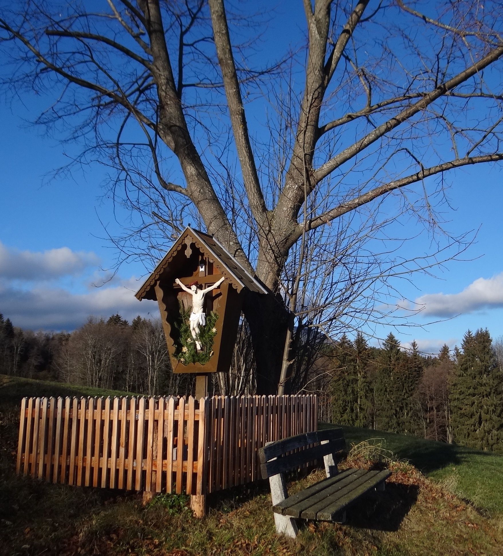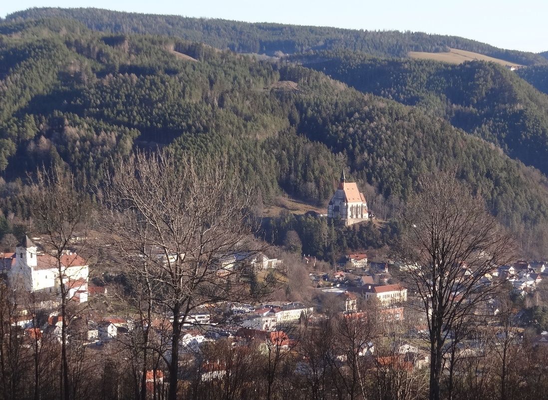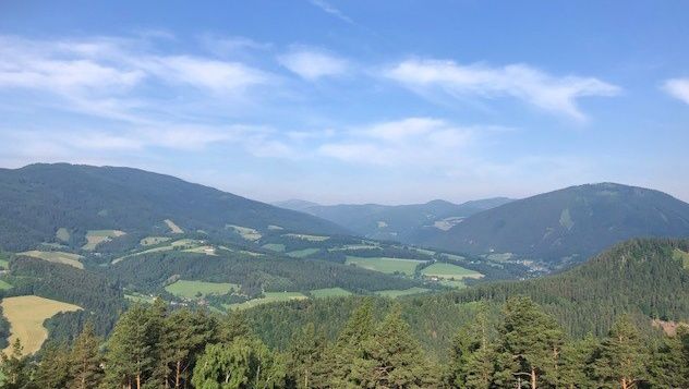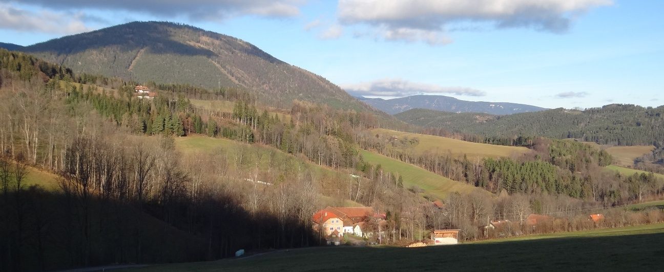 Ezt az utat követjük a következő éles jobbra ívelő kanyarig, majd a sárga jelzés balra mutat, ahol viszonylag meredeken felfelé haladunk a mező szélén. Végül elérünk egy útmenti kegyhelyhez egy paddal, ahol megtehetjük az első jól megérdemelt pihenőnket, és élvezhetjük a Kirchbergre és a két templomára nyíló kilátást. Most egy darabig az aszfaltúton haladunk a "Kreuzbauern"-ig, majd egy erdei ösvényen belépünk az erdőbe. Hamarosan elérünk egy elágazáshoz. A bal oldali a Steyersberger Schwaig felé vezet, a jobb oldali pedig vissza a völgybe. Mi a középső, sárga jelzésű ösvényt választjuk. Ezután viszonylag sokáig ezen a már benőtt erdei ösvényen túrázunk. Végül kijutunk az erdőből, és átkelünk egy természetes gáton, az úgynevezett "Holzgasse"-on, amely már az Alpltal-völgyben van. Itt is egy pad hívogat pihenésre. Itt is előttünk van a vidra és gyönyörű kilátás nyílik a Raxra.