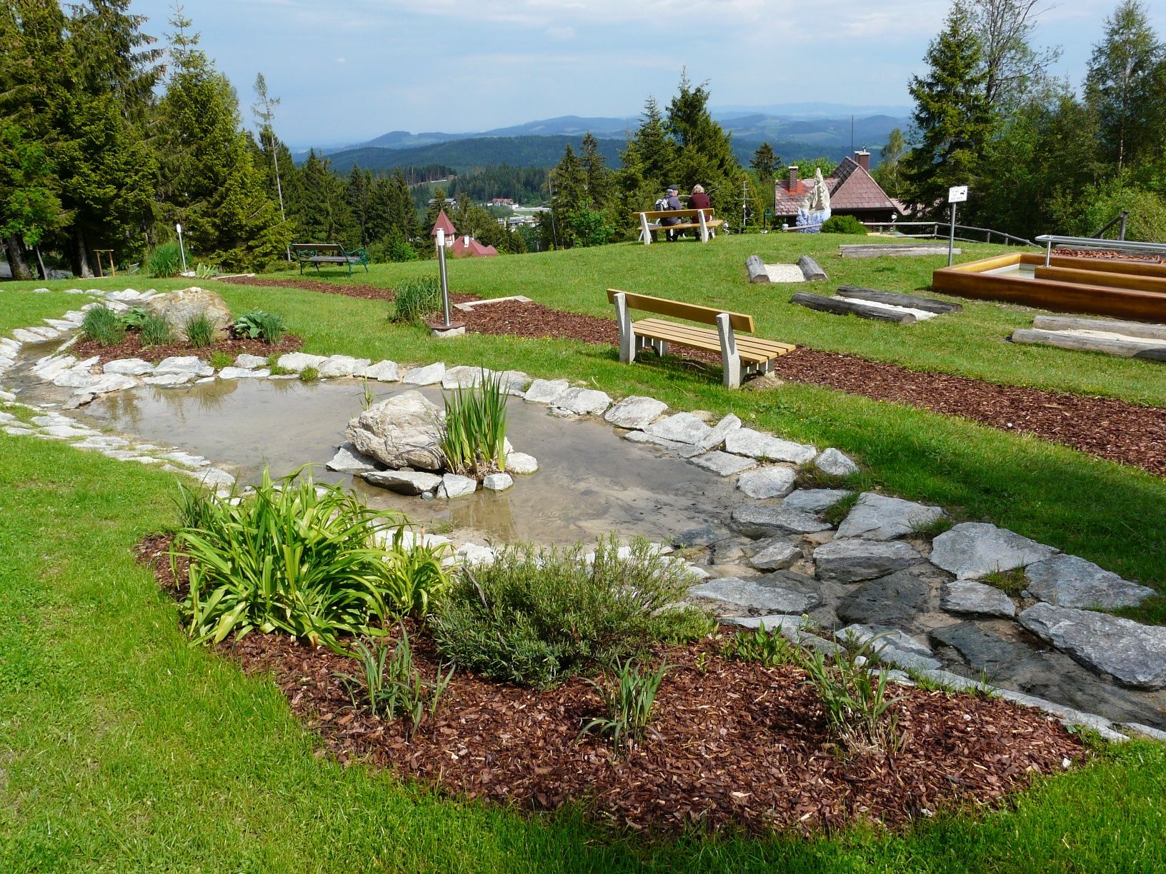 A tematikus vizes tanösvényen a víz körforgásával kapcsolatos kérdéseket fedezhetsz fel, az esőtől a forrás eredetén át a patakokig és tavakig.