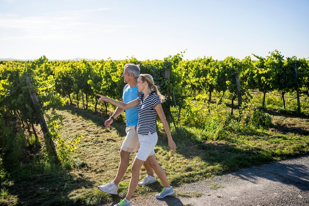 Könnyű túra Langenlois pincesorain és szőlőskertjein keresztül, gyönyörű kilátással.