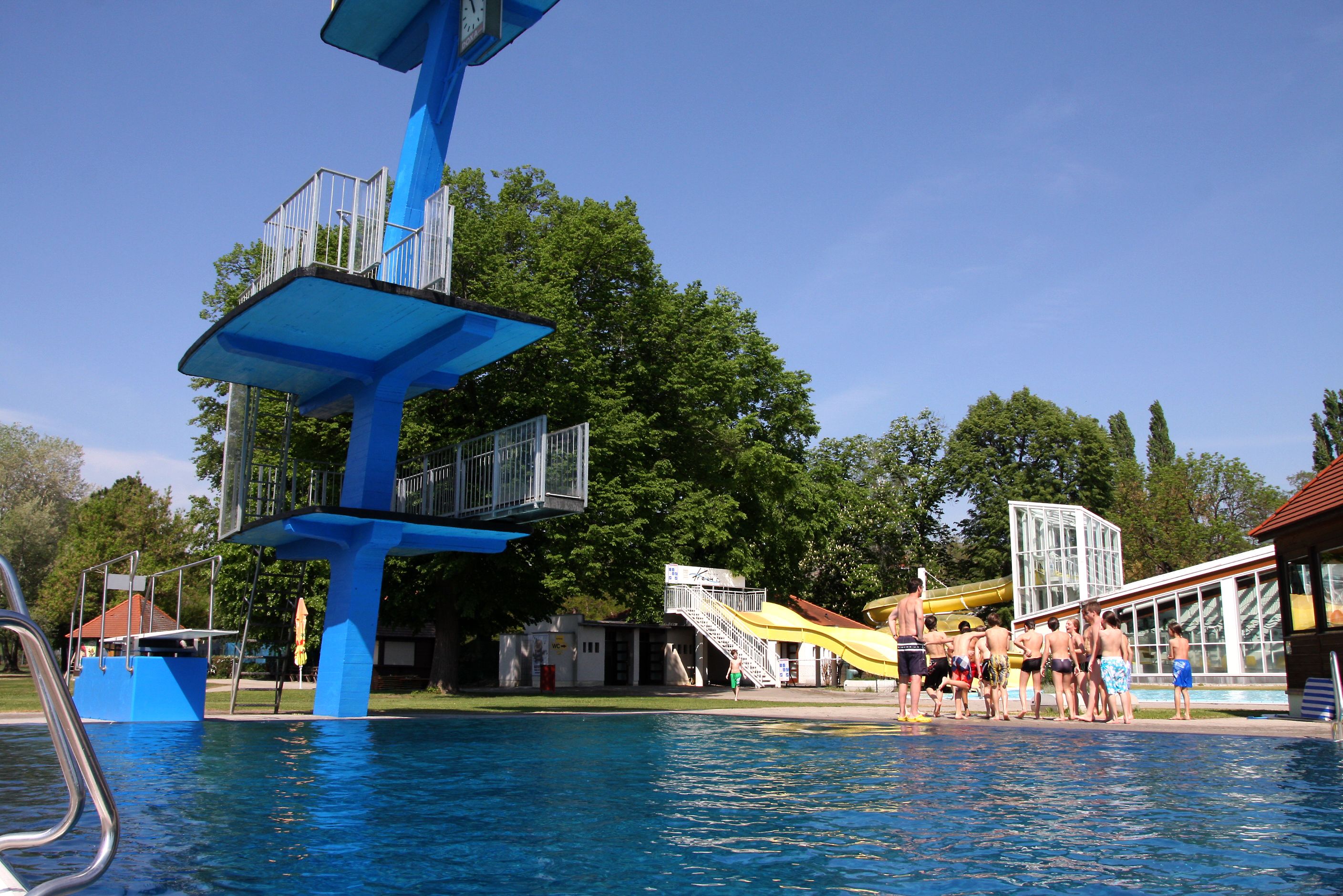 A nyári medencében 50 méteres sportmedence, 20 méteres nem úszómedence, 3,80 méter mély búvármedence, ugrótorony célmedencével, 15 méter széles csúszda célmedencével, a fedett medence fűtött kültéri medencéje, gyermekrészleg két csúszdával, játszópatakkal és játszótérrel, pelenkázó, 3 strandröplabdapálya, asztalitenisz és labdajátékok területe. A fedett medence csúszdája a nyári medencéből is használható.