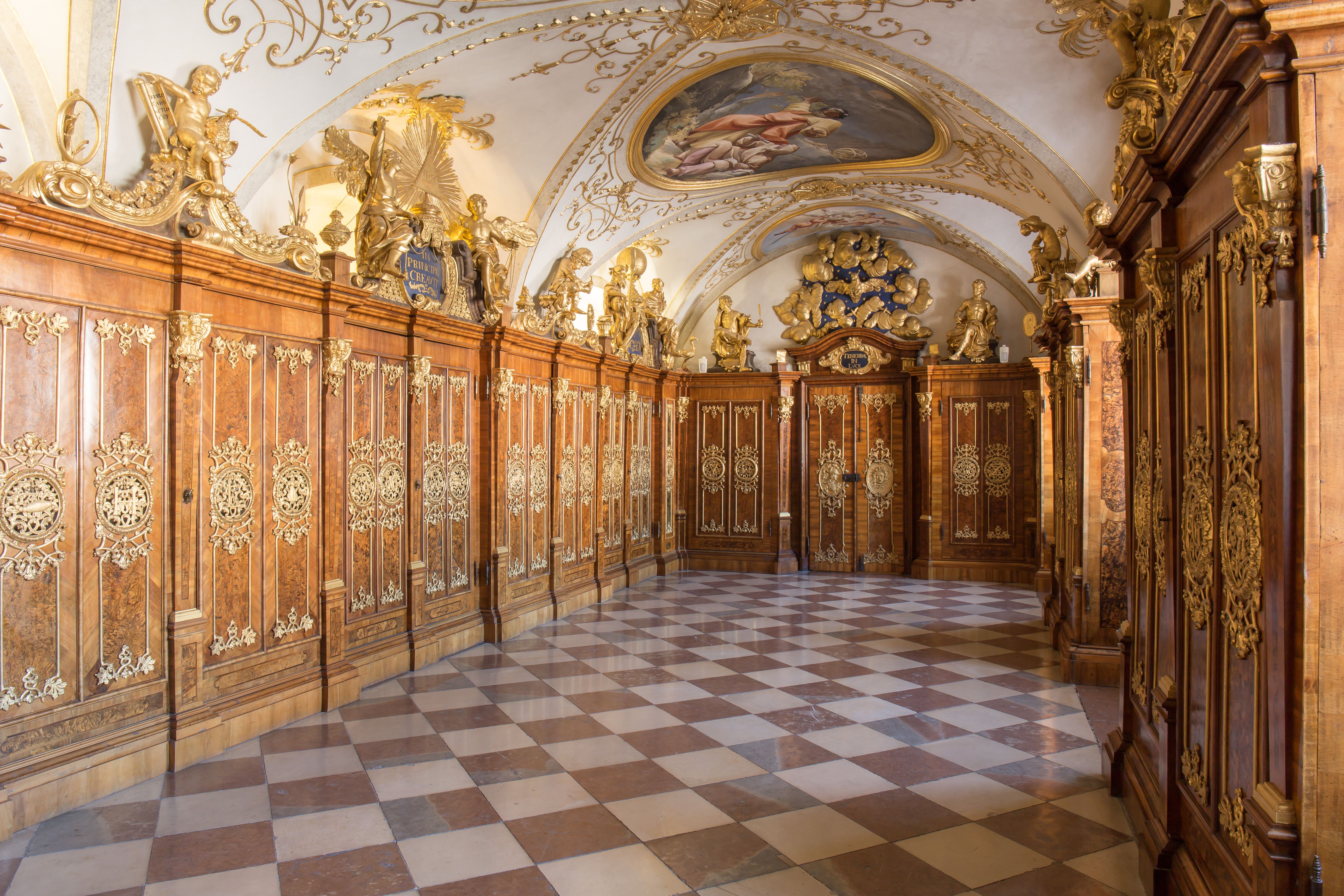 - Freskók és festmények: a fal- és mennyezetfestmények főként Thomas Friedrich Gedon és Daniel Gran alkotásai, bár néhányat később Bartolomeo Altomonte műveivel helyettesítettek.