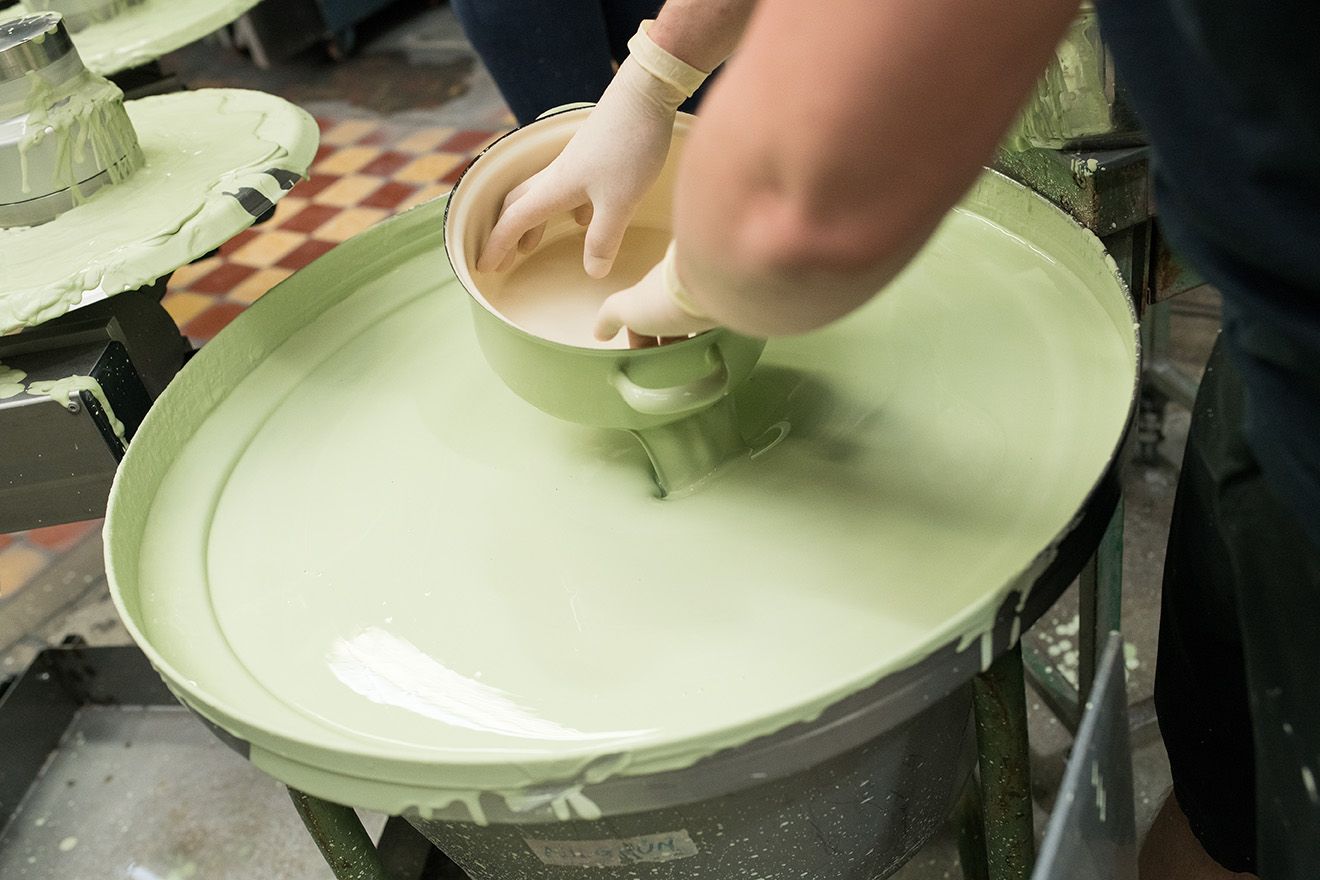 - Látogatás a zománcgyárban: Láthatja, hogyan viszik fel a zománcot a formákra, és hogyan olvasztják meg 850°C-on a kemencében.