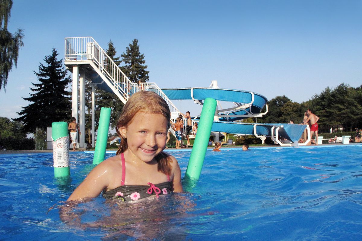 A forró nyári napokon a 42 méteres csúszdával ellátott kültéri medence ideális hely az úszók és az úszni nem tudók számára a hűsölésre, valamint a kicsik számára a gyermekmedence.