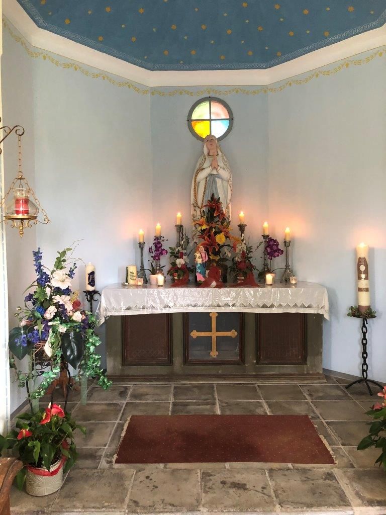 A ház bejáratánál álló Parkfrieder-kápolna a legnagyobb kápolna a plébánián.