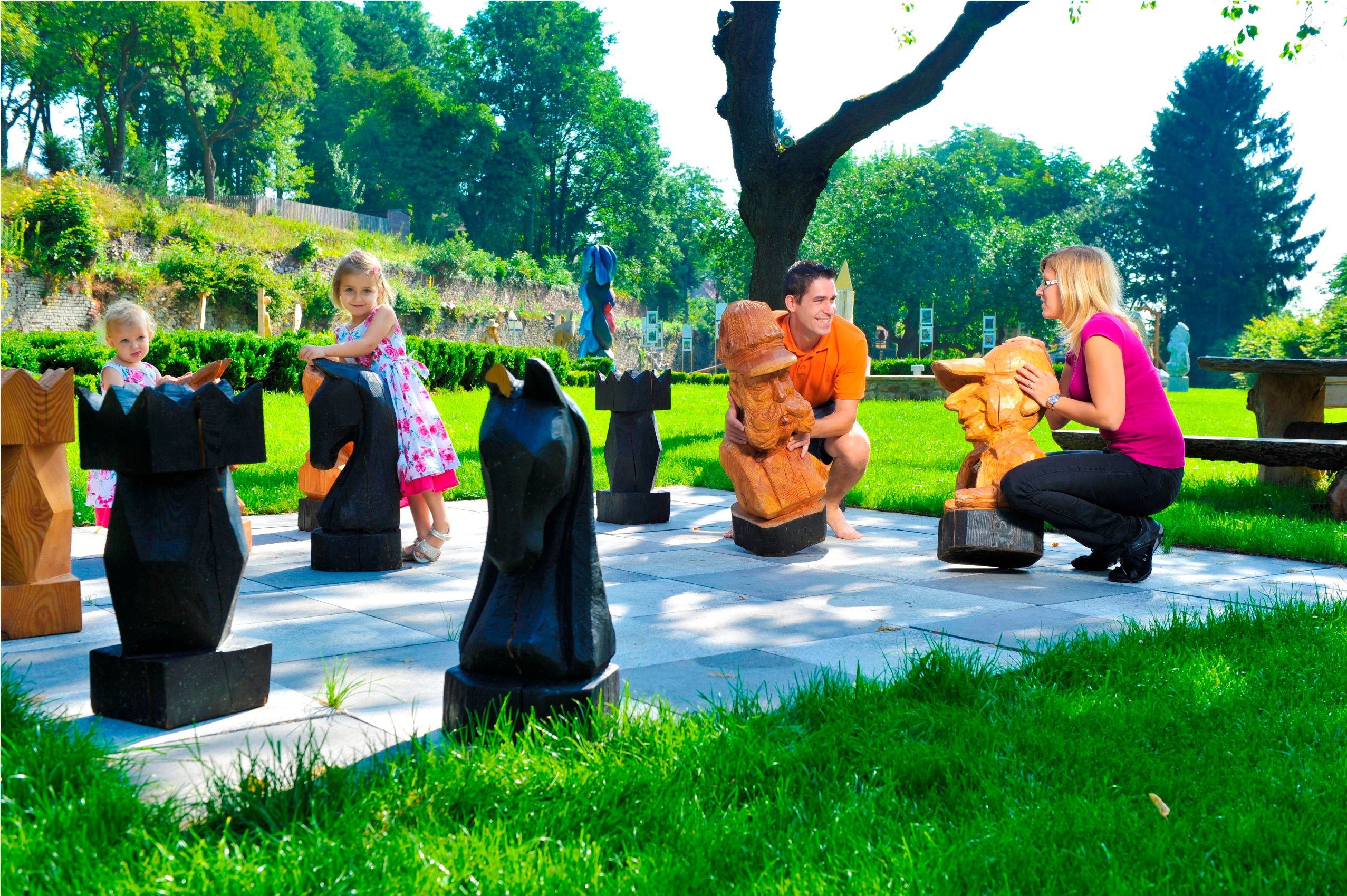 A napraforgók, kúszórózsák, 250 éves tiszafák és történelmi gyümölcsfajták mellett a karikatúrakert középpontját kőből, fából, kerámiából és vas ból készült karikatúraszerű tárgyak alkotják. Ez teszi a kert egészét egyedülállóvá a német nyelvterületen.