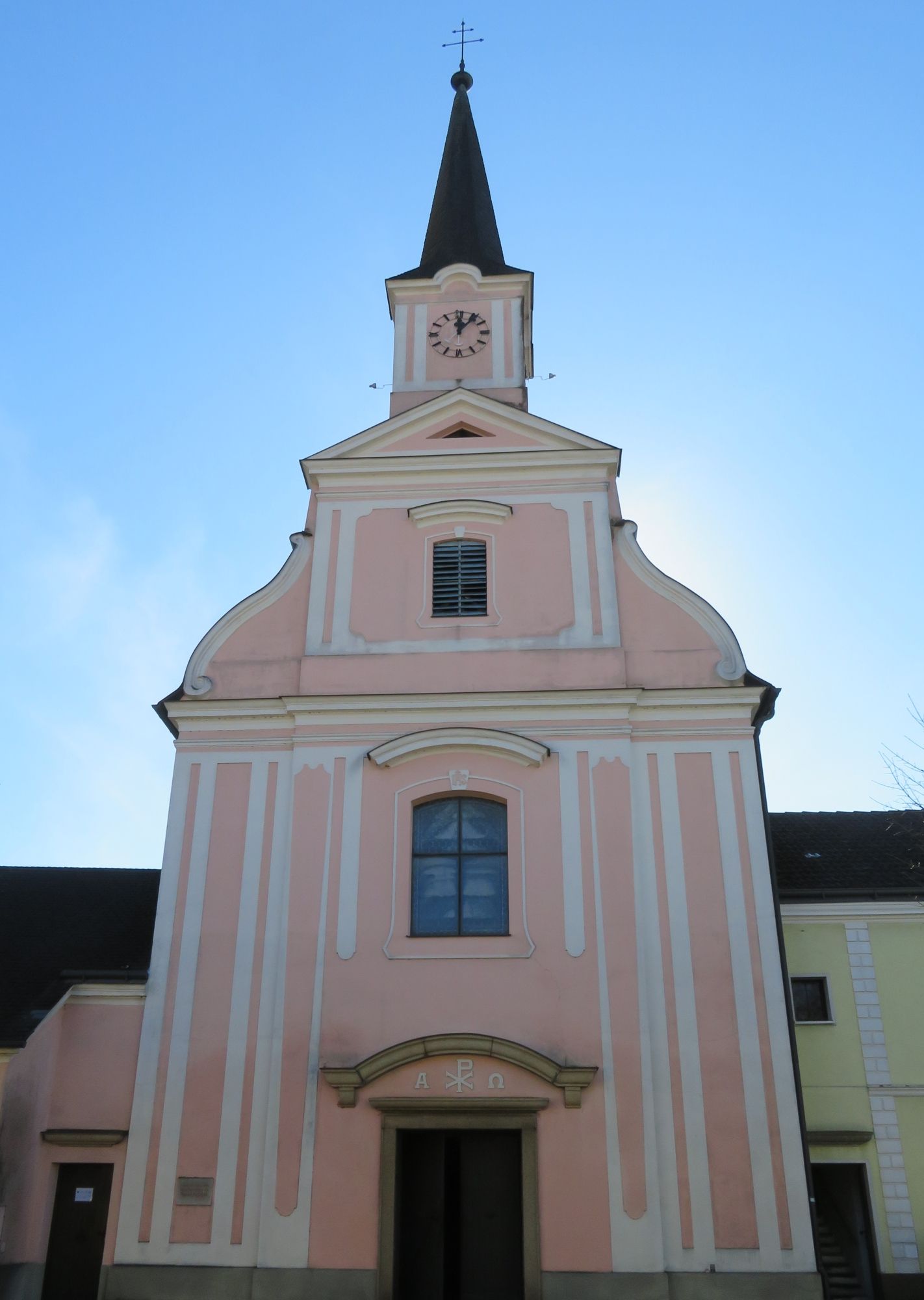 A templom egyszerű, déli fekvésű barokk épület (1750 körül), bővítésekkel. A szabadon álló nyeregtetős homlokzat a mögötte rejtőző tetőgerendákkal a 19. század 2. feléből származik. Az oldalhomlokzatokat a szomszédos házak nagyrészt eltakarják. A nyugati oldalon a galériára és a toronyba vezető lépcsőház csatlakozik. Kelet felé a középkori Hedvig-kápolna kórusa található, a sekrestyéhez vezető folyosóval (1840 körül).
