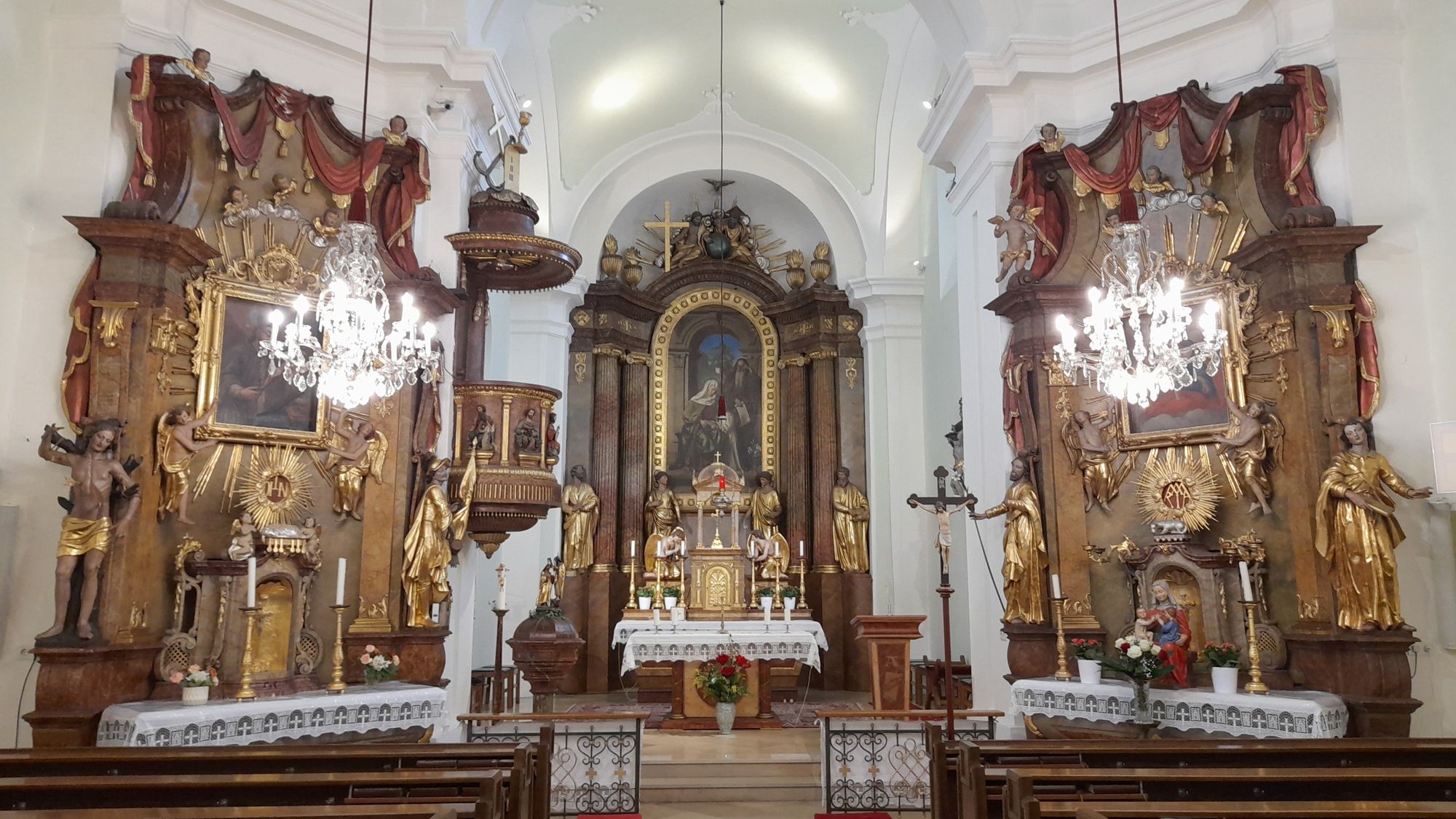 A klasszicista stílusú főoltár 1833-ból származik. Az oltárkép a liechtensteini herceg ajándéka. Szent Máriát ábrázolja szüleivel, Szent Joachimmal és Szent Annával.