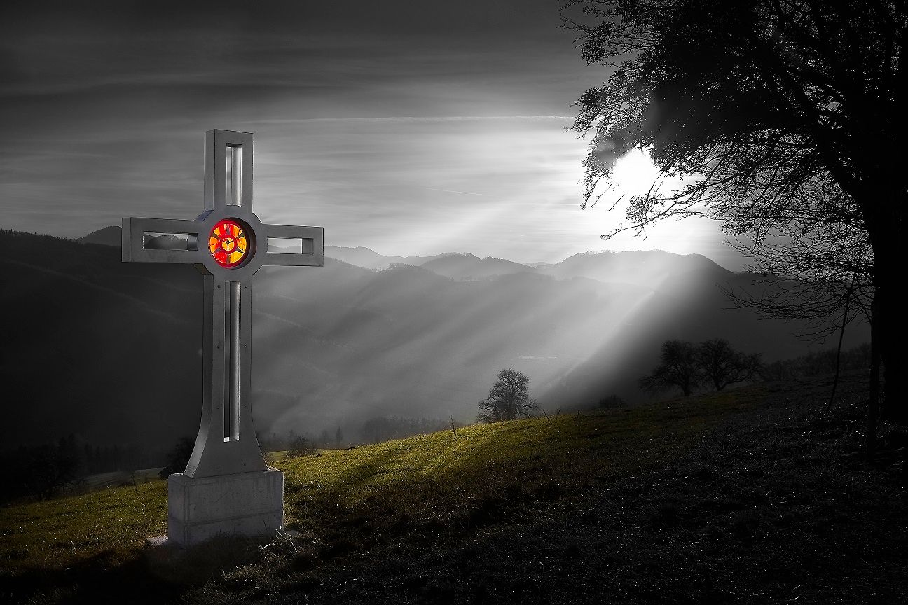 A dombon álló kereszt (amelyet 2011-ben állított fel a Hofstetten-Grünau helytörténeti kutatócsoport) messze a völgybe ragyog.