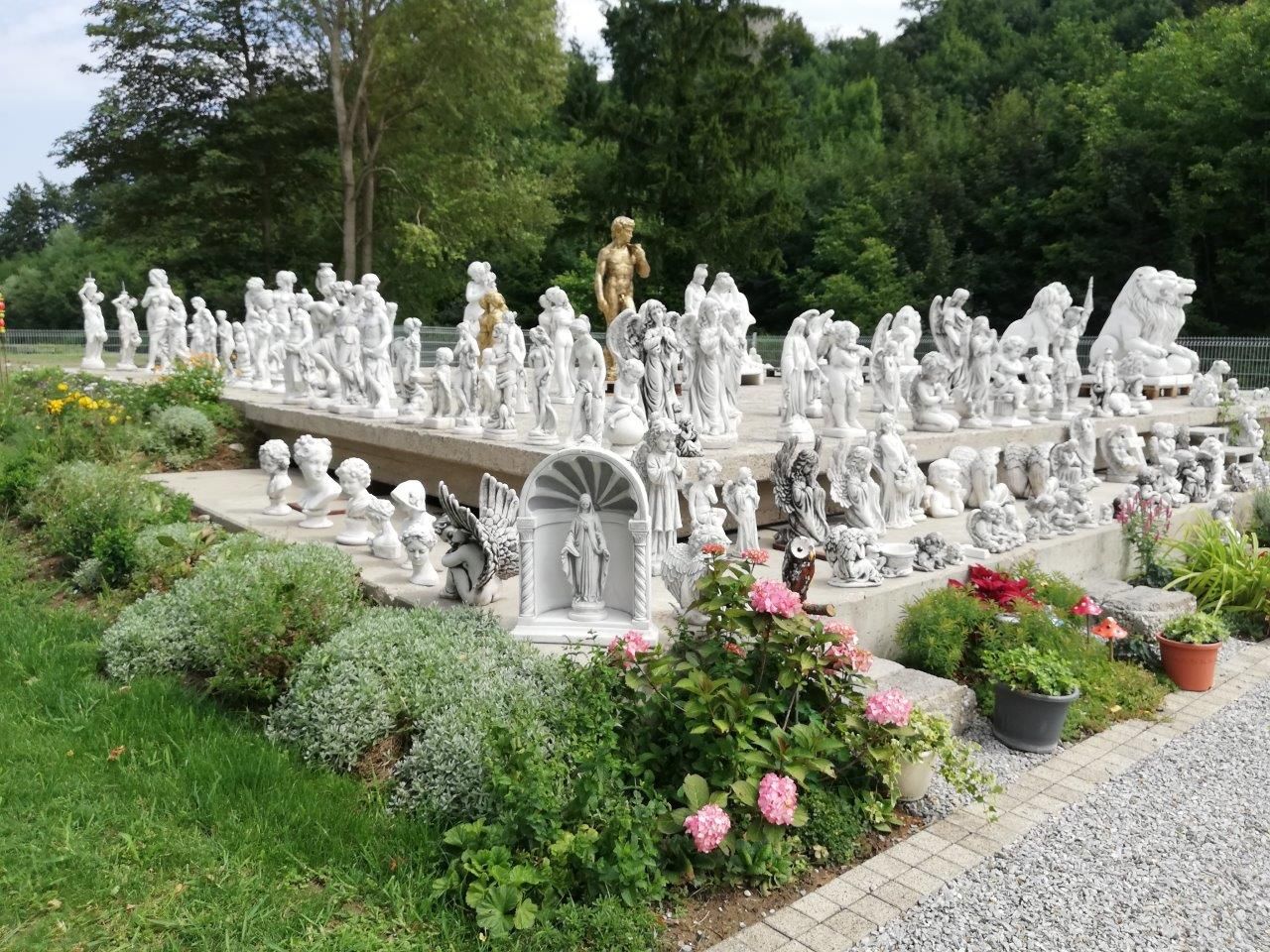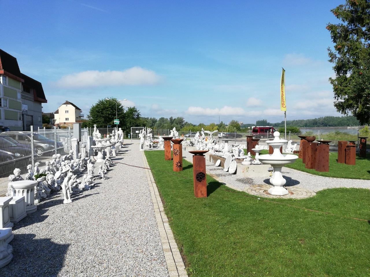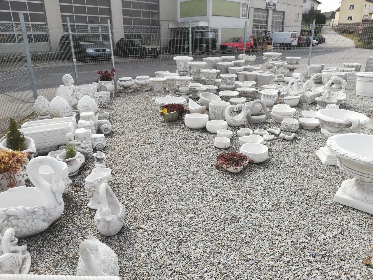 Fagyálló betonfigurák: szökőkutak, szobrok, talapzatok, asztali szettek, virágcserepek, növényvályúk, vázák, gyermek- és állatfigurák, madárfürdők, sárkányok, vízköpők, Buddha-szobrok, pagodák, angyalok, sírdíszek.