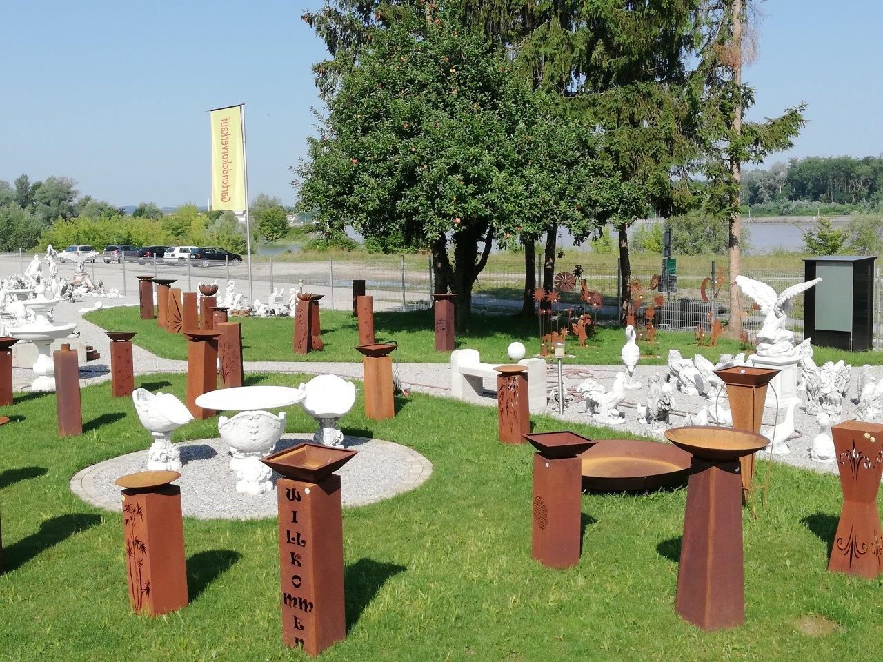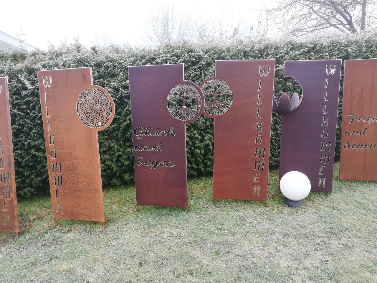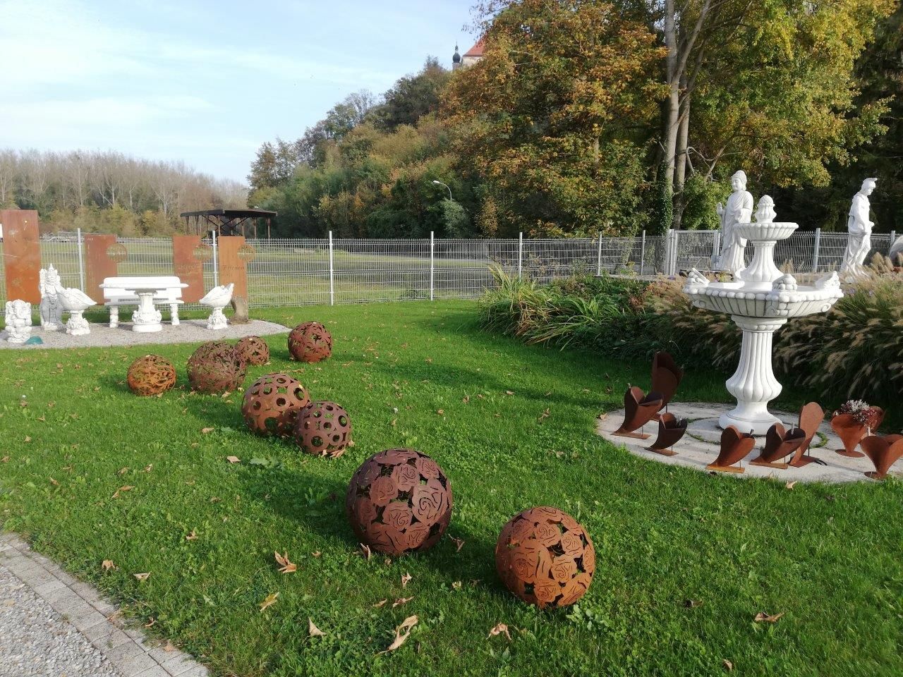 Rozsdamentes acél kerti dekorációk: oszlopok, tűzrakó tálak, kilátótáblák, virágok, kerti dugók, gömbök, napórák.