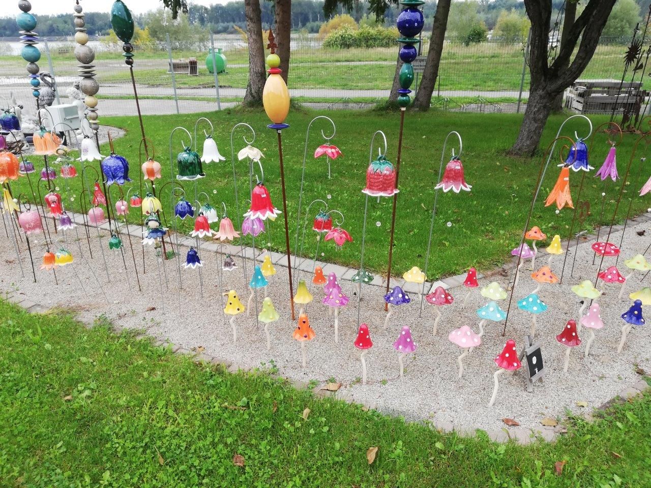 Kerámia kerti dekorációk: virágok, szélcsengők és kerámia gombák.