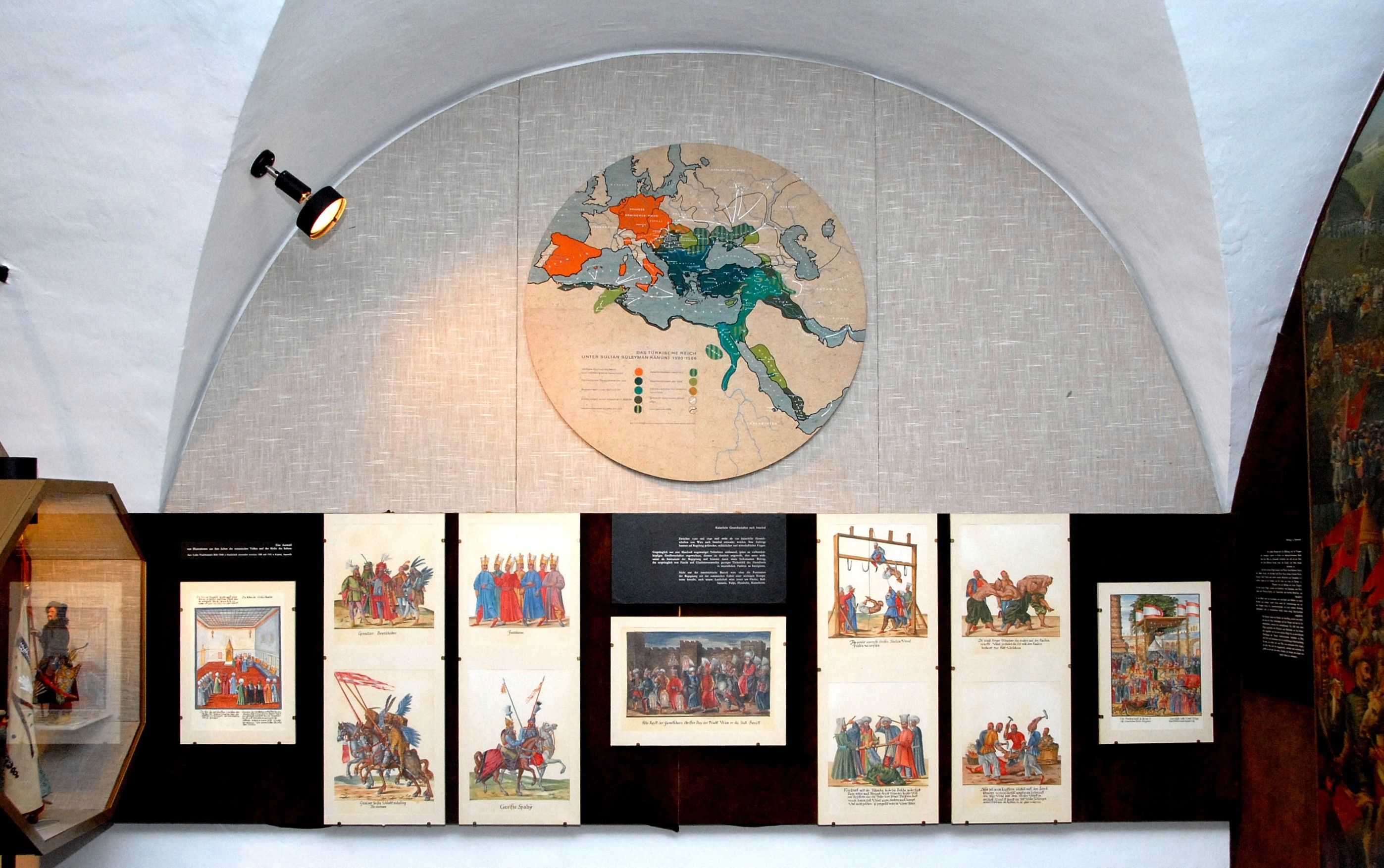 A kiállításon számos eredeti műcsoport szerepel. Egy 1700-ból származó falfestmény mellett például nagyszámú, Bécs 1529-es és 1683-as ostroma alkalmából vert érem. Hans Ludwig von Kuefstein báró nagykövetségéhez kapcsolódóan 1628/29-ben készült gouache-ok gyűjteménye is látható. A kiállítás különlegességei közé tartoznak továbbá makettek, török fegyverek és osztrák és oszmán csapatok részletes figurái.