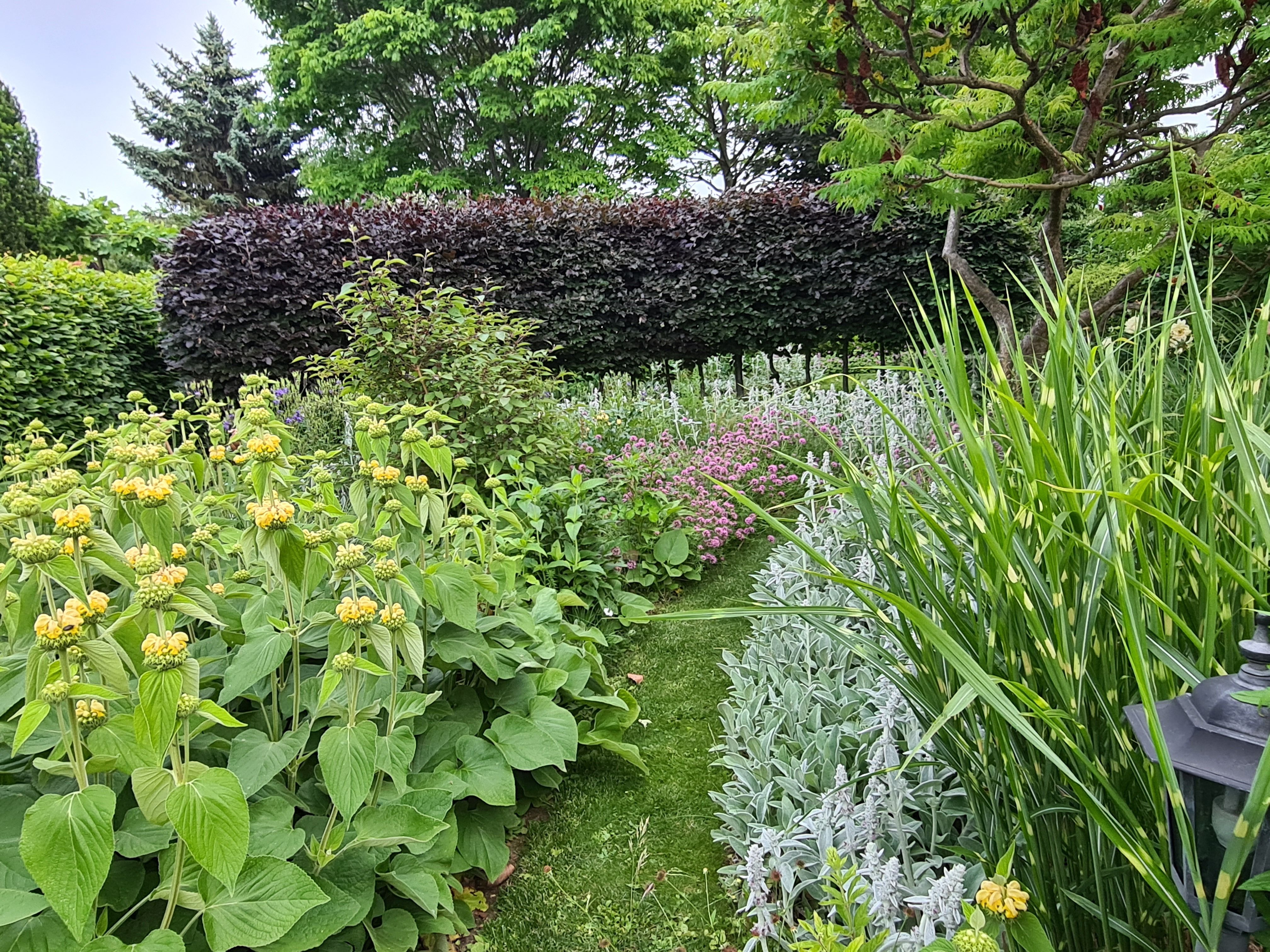 Az egész területet egy jól átgondolt ösvényhálózat nyitja meg, amelyet buja virágágyások kísérnek. A sövények terekre osztják a kertet, és vizuális tengelyeket hoznak létre. Az elmúlt években régi téglákból további építészeti elemeket hoztak létre, valamint számos ülőhelyet, szimmetrikus zöldségeskertet, egy bokorfával szegélyezett rózsakereket és a szivárvány színeiben beültetett süllyesztett kertet. Vezető növények a bokor, a rózsa, a liliom, a funkia, a karvaly és a fűfélék. A megfelelő megvilágítás és a sok fehér virágú és ezüstlevelű növény használata a kertet éjszakánként ragyogóvá teszi. A tavasz korai hírnökei, a buja nyári virágzók, a ragyogó őszi színek és a bizarr téli minták állandóan változó kertképet teremtenek, és az év bármely szakában vonzóvá teszik a kertet.