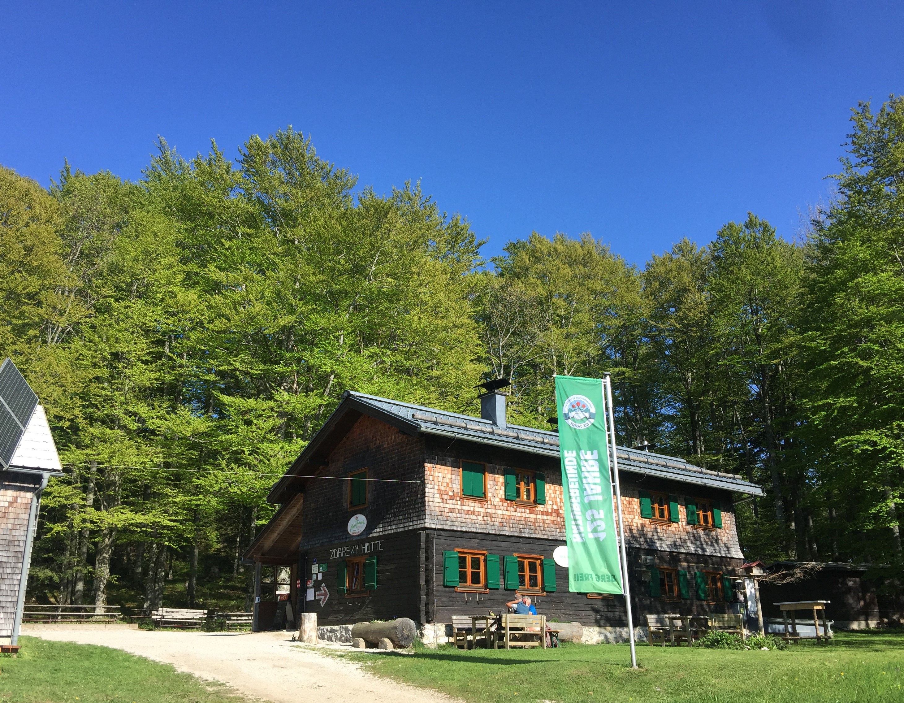A Traisenberg 1082 méteren lévő Zdarsky-hütte megállásra invitál: változatos virágokkal, játszótérrel és közel 40 éjszakázóhellyel.