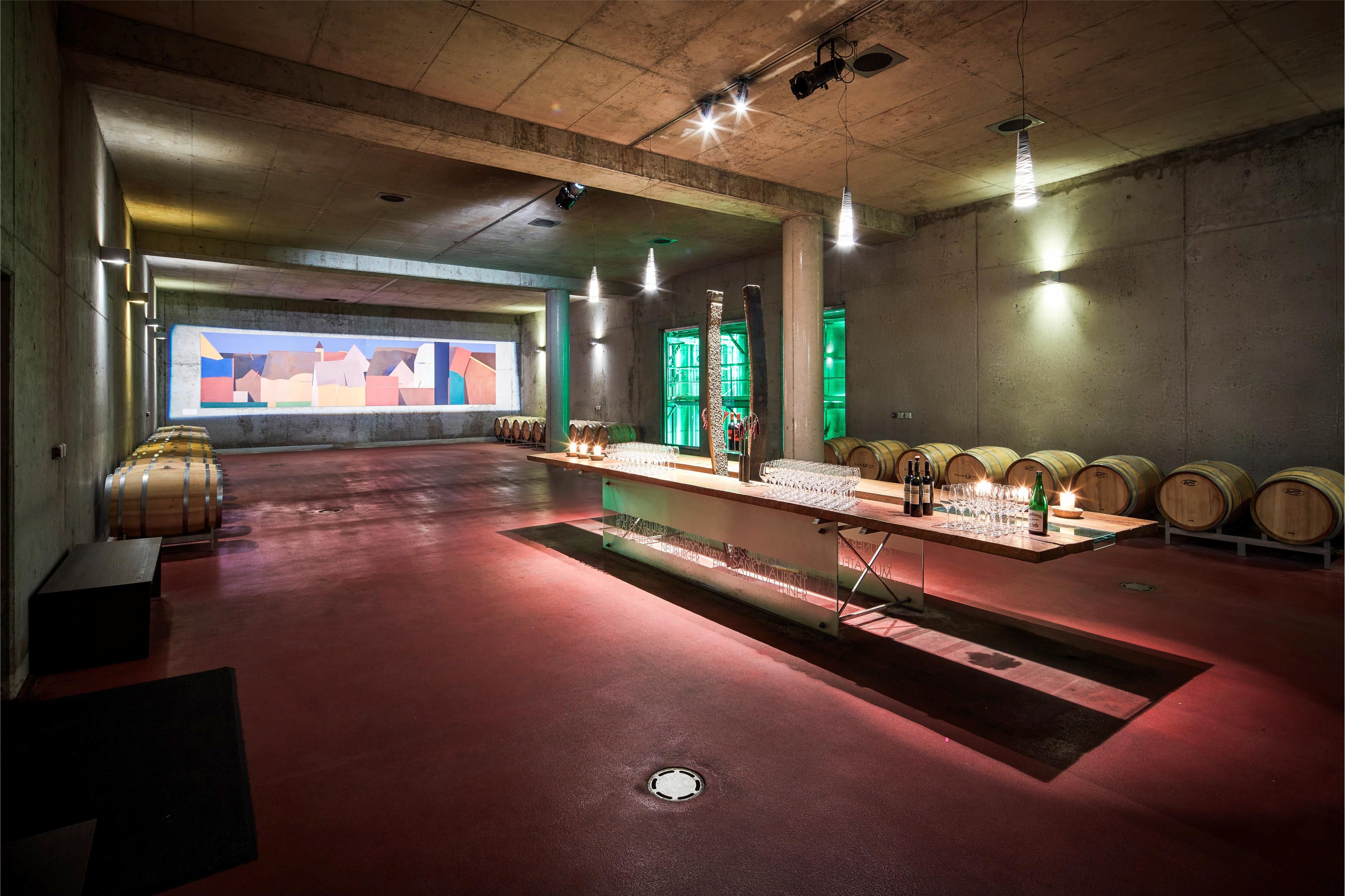 • Wein.Keller: A barrique pincében a boroltáron egy pohár kék zweigelt várja a vendégeket. Három impozáns üvegfelület betekintést nyújt a Winzer Krems erjesztő- és érlelőpincéjébe.